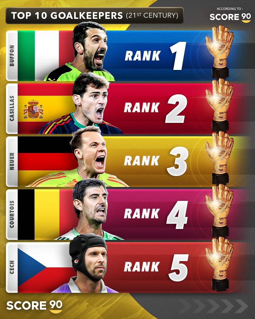 این دو تصویر جذاب مربوط به رتبهبندی برترین دروازهبانهای قرن ۲۱ از نگاه صفحه فوتبالی معروف Score 90 است. در این فهرست، نامهایی دیده میشود که هر کدام تاریخساز فوتبال جهان بودهاند. این رتبهبندی نهتنها بر اساس افتخارات تیمی و فردی انجام شده، بلکه ثبات عملکرد، رهبری در زمین و تأثیرگذاری بر نسلهای بعدی نیز در آن نقش مهمی داشته است. در ادامه، به تحلیل و معرفی هر یک از این دروازهبانان میپردازیم تا بدانیم چرا در بین برترینهای قرن ۲۱ جای گرفتهاند.