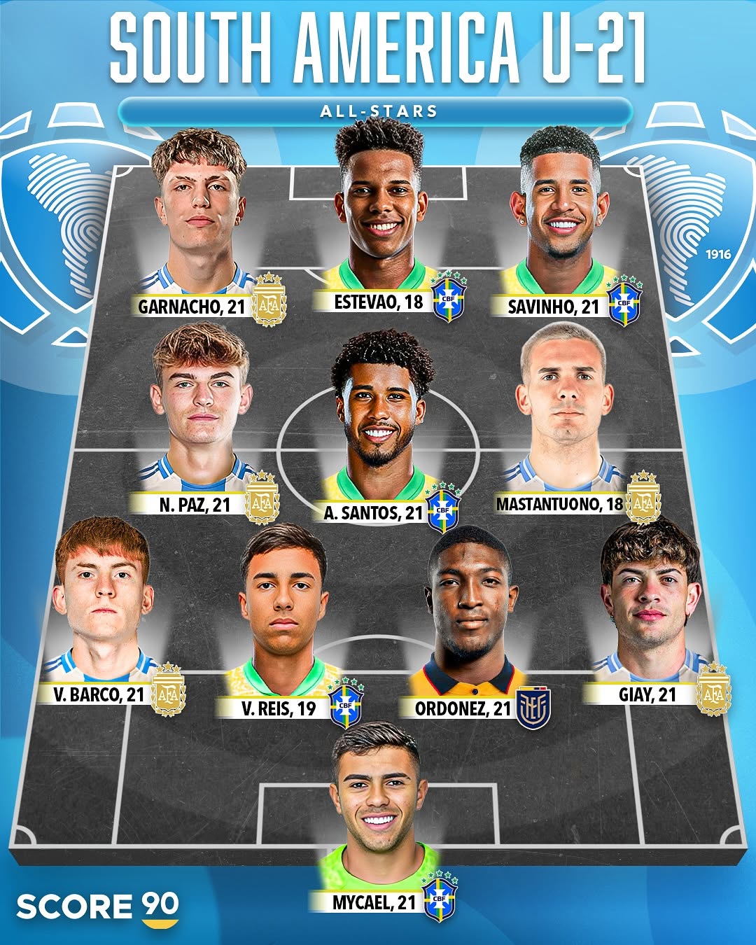 در تصویر دوم، تیم South America U-21 All-Stars به نمایش درآمده است. در این ترکیب، ستارگان جوانی از کشورهای برزیل، آرژانتین و اکوادور دیده میشوند. در خط حمله، آلهخاندرو گارناچو از آرژانتین و دو پدیده برزیلی استِوائو و ساوینیو قرار دارند. گارناچو که در منچستریونایتد بازی میکند، یکی از امیدهای اصلی فوتبال آرژانتین است. استِوائو نیز به عنوان "پسر جادوگر" برزیل شناخته میشود و آیندهای درخشان در اروپا پیشرو دارد.