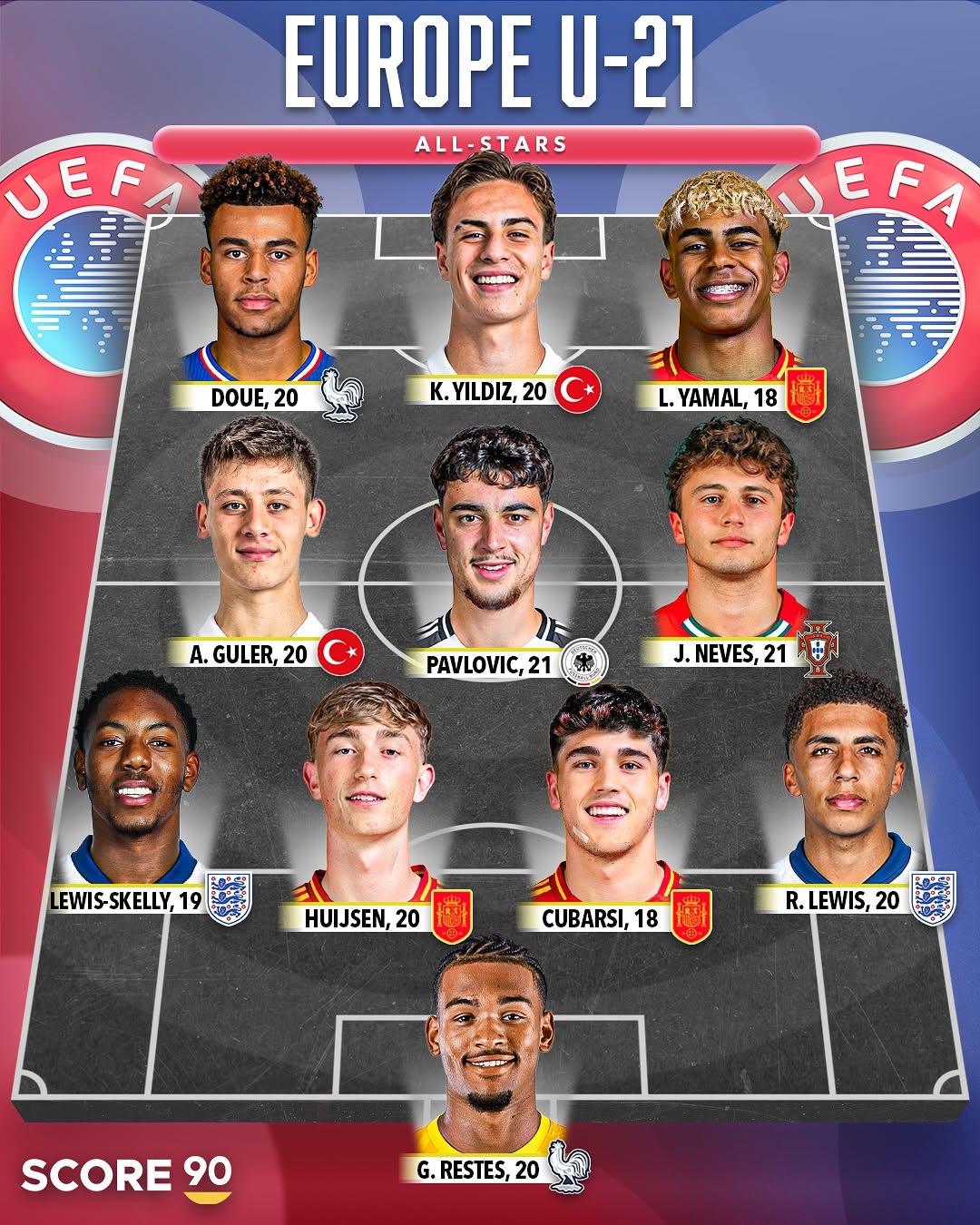 در تصویر نخست، تیم Europe U-21 All-Stars دیده میشود. این تیم مملو از بازیکنان بااستعداد از کشورهای مختلف اروپایی است. در خط حمله، کنی ییلدیز (ترکیه)، لودویک دوه (فرانسه) و لامین یامال (اسپانیا) قرار دارند. یامال، پدیده جوان بارسلونا و تیم ملی اسپانیا، در سن ۱۸ سالگی یکی از درخشانترین استعدادهای فوتبال جهان به شمار میرود. در خط میانی، بازیکنانی چون آردا گولر از ترکیه، پاولویچ از آلمان و ژوآئو نِوس از پرتغال حضور دارند که هر سه نفرشان در سطح باشگاهی نیز عملکرد چشمگیری دارند. گولر با درخشش در رئال مادرید، آیندهای درخشان پیشرو دارد و نِوس نیز با تکنیک بالا و هوش بازی مثالزدنی خود یکی از امیدهای فوتبال پرتغال است.