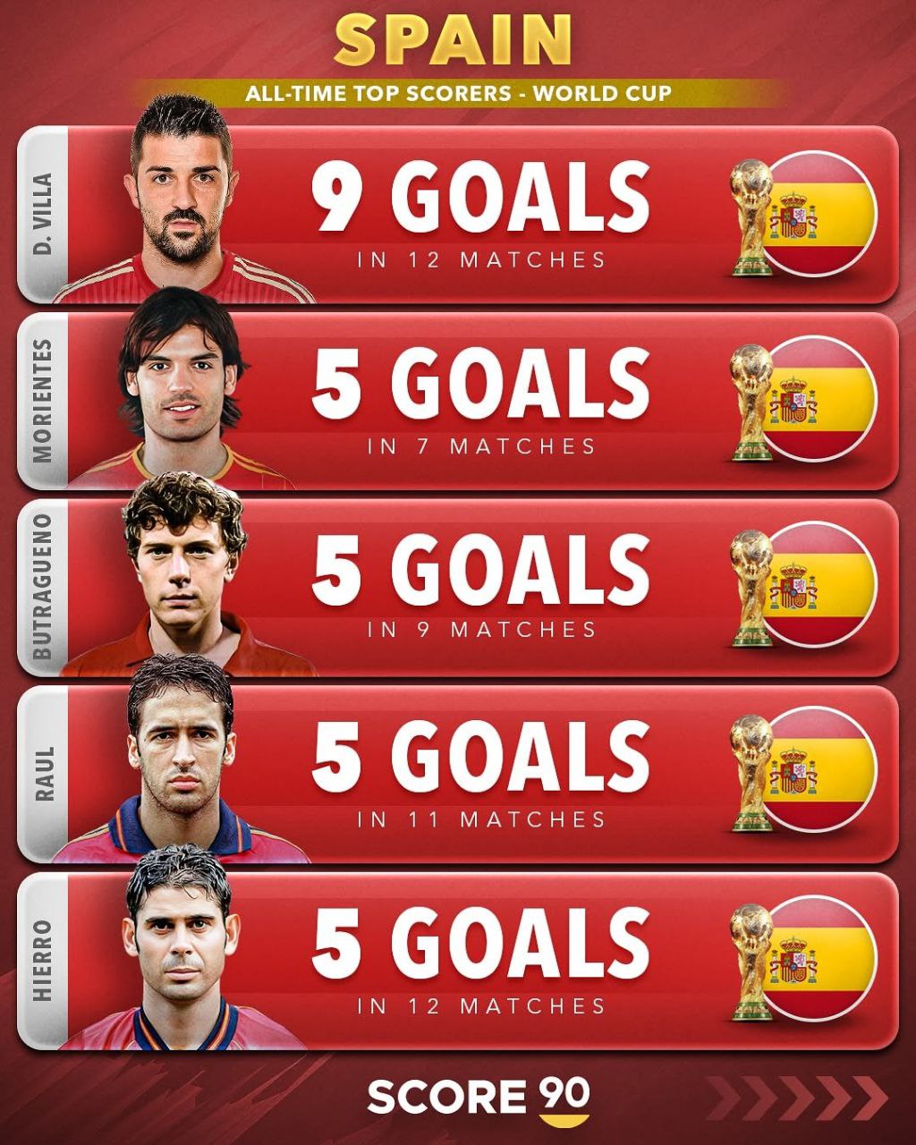 داوید ویا با ۹ گل در ۱۲ بازی، به تنهایی در صدر جدول قرار دارد. این مهاجم مرگبار در سه دوره جام جهانی برای اسپانیا به میدان رفت و نقش کلیدی در قهرمانی تاریخی این تیم در آفریقای جنوبی ۲۰۱۰ ایفا کرد.