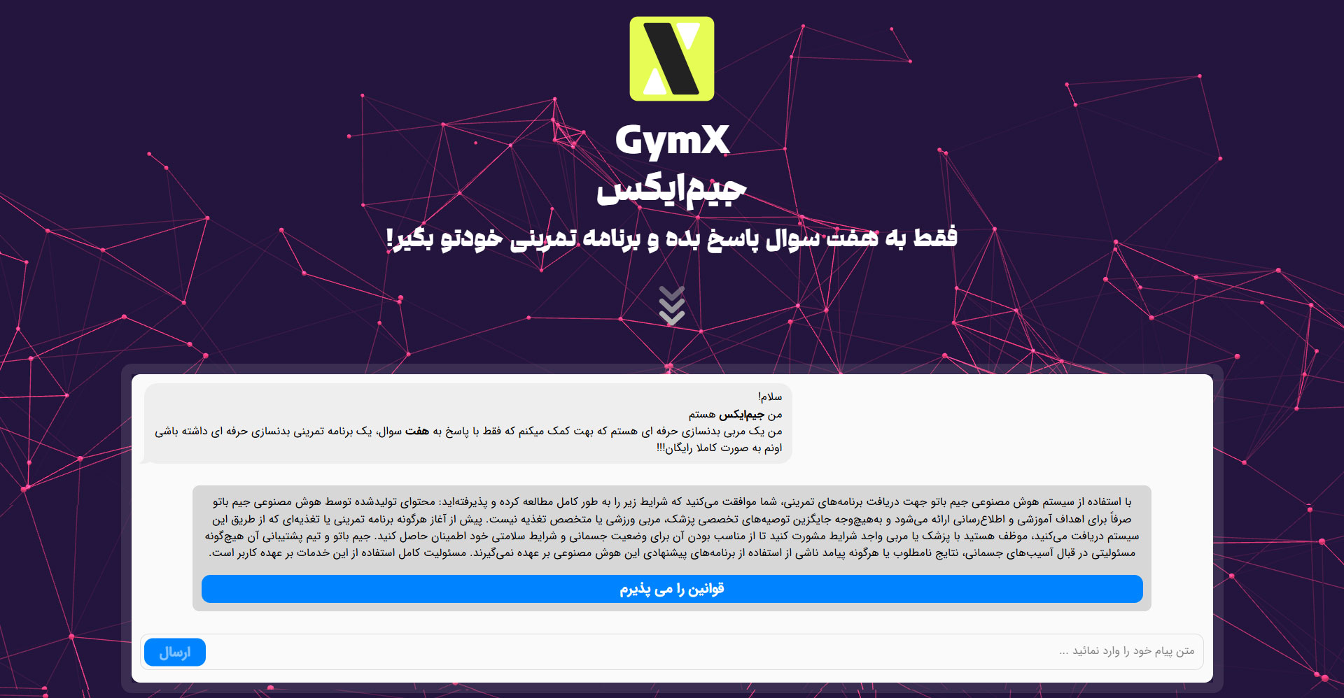 GymX یک هوش مصنوعی فارسیزبان است که روی وب سایت «جیمباتو» توسعه یافته و هدف آن ارائه برنامه تمرینی متناسب با ویژگیها و اهداف هر فرد است. روند استفاده از آن بسیار ساده است: شما فقط به چند سؤال پایهای مثل سن، وزن، تجربه تمرینی، آسیب دیدگی و... پاسخ میدهید سپس این سیستم در عرض چند ثانیه یک برنامه تمرینی اختصاصی و اصولی برای شما تولید میکند.
