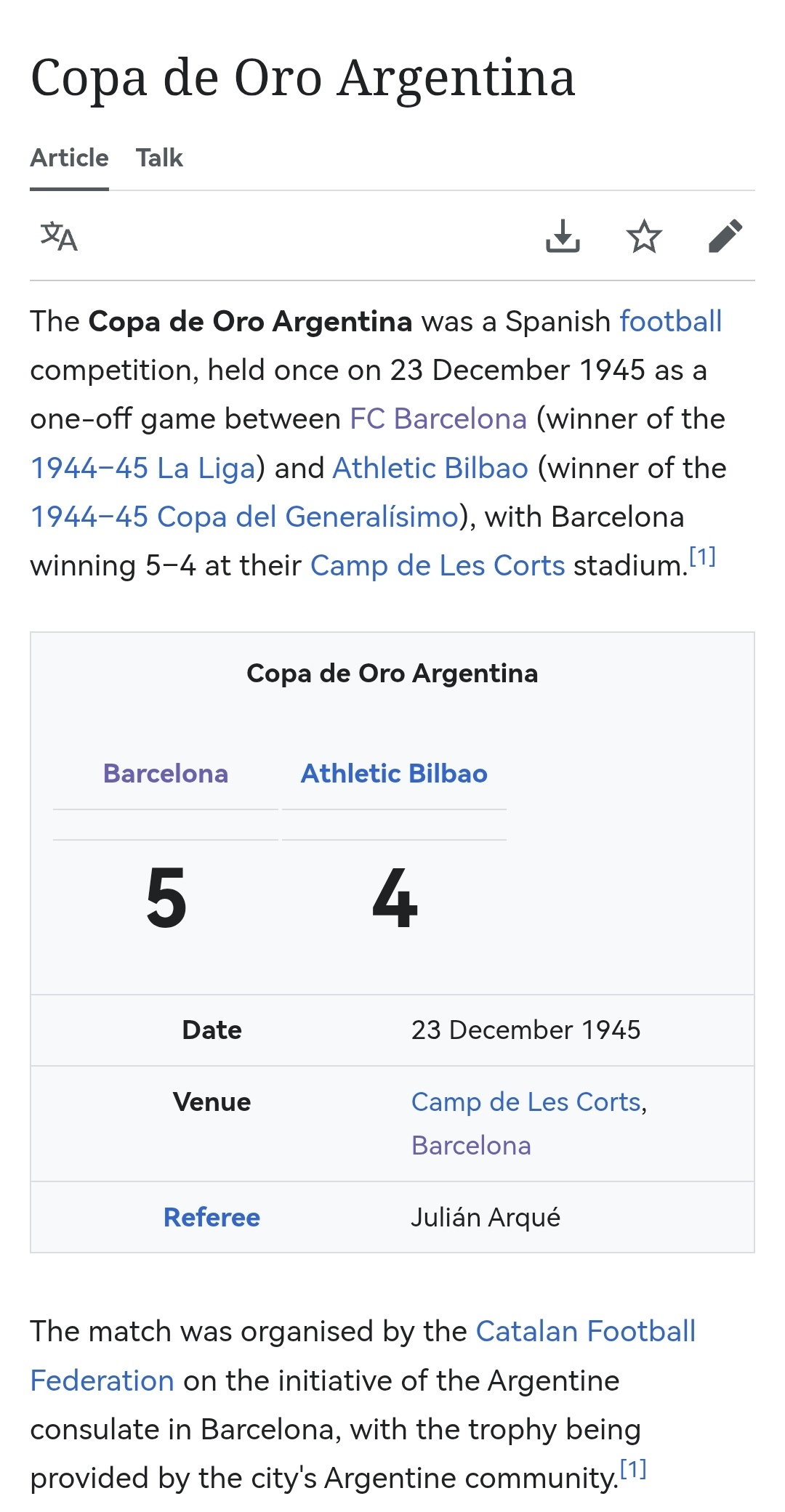 بازی به شدت جذاب پیش میرود و در نهایت بارسلونا مقابل اتلتیک بیلبائو با نتیجه هیجان انگیز ۴-۵ در رقابت کوپا د اورو ارخنتینا به قهرمانی میرسد . این جام هرگز در بین افتخارات رسمی بارسا لحاظ نشده .