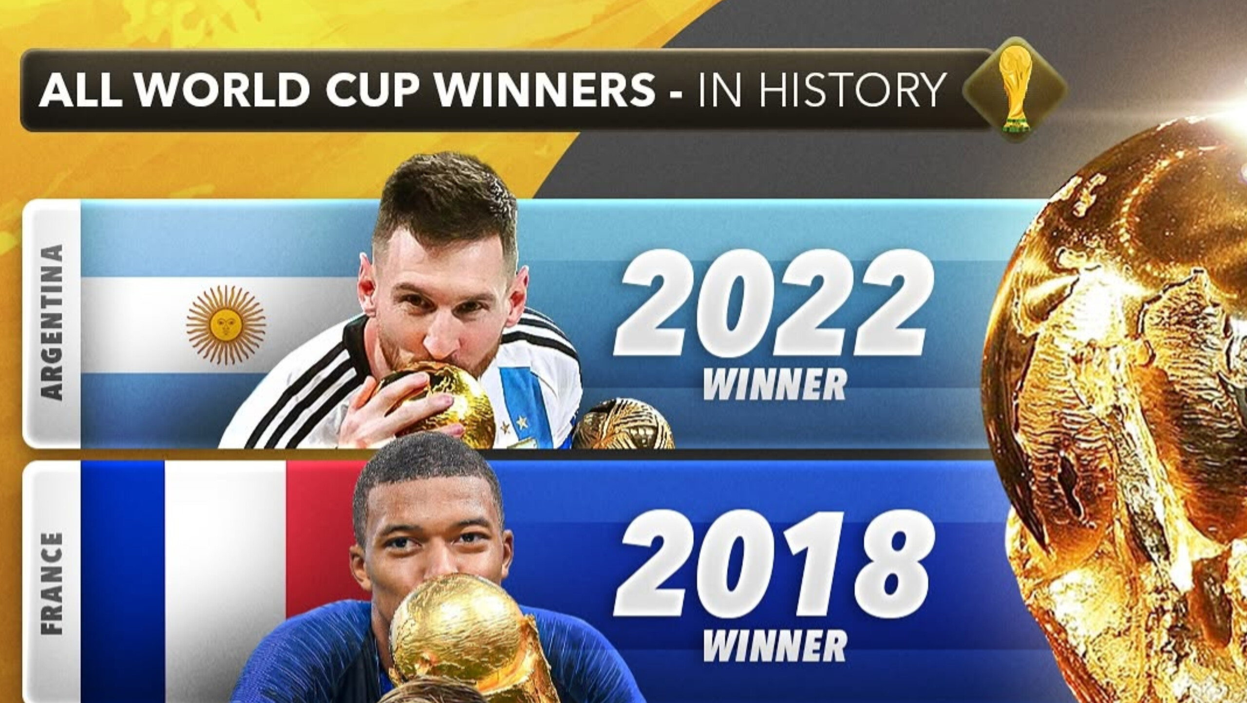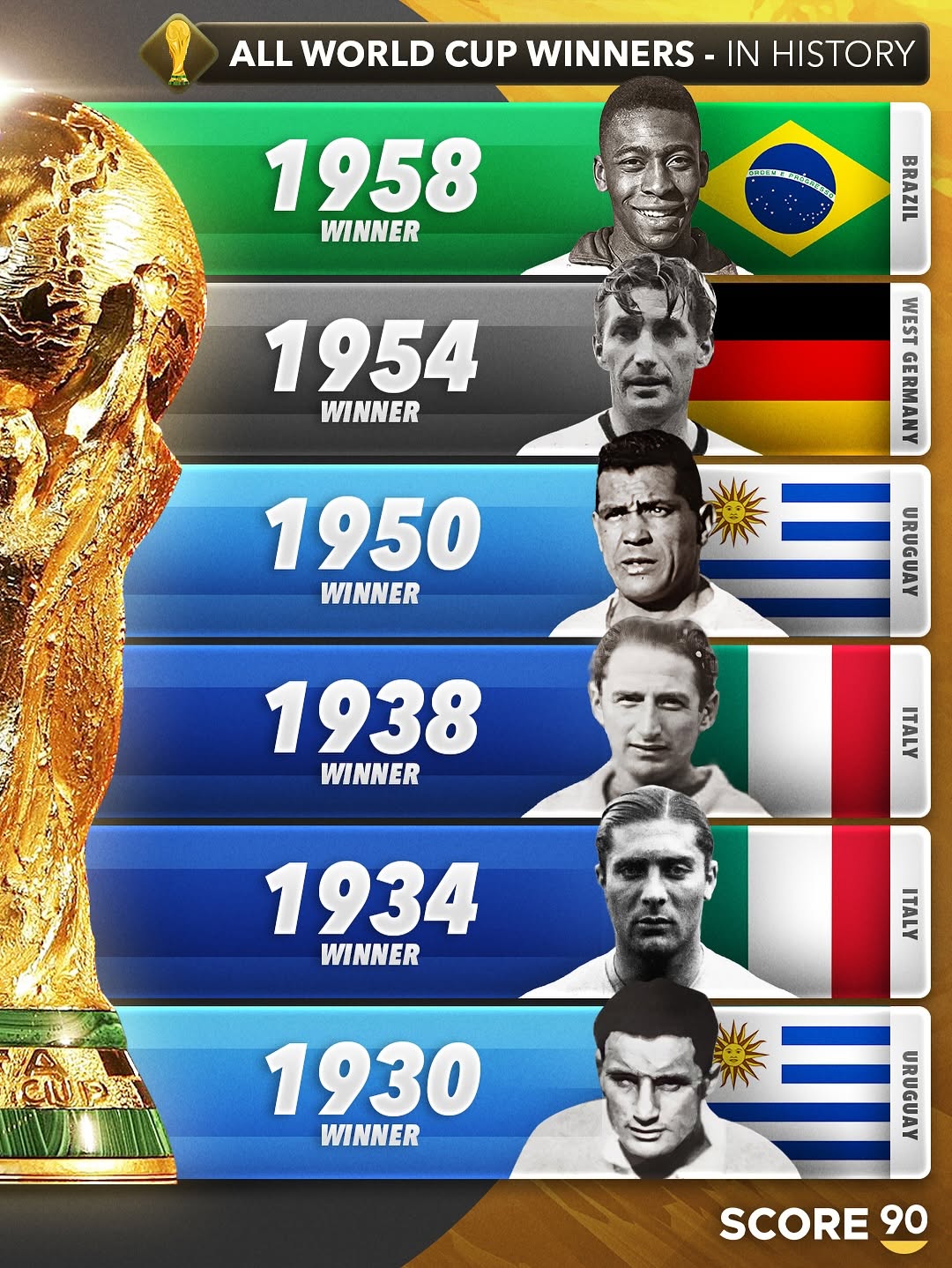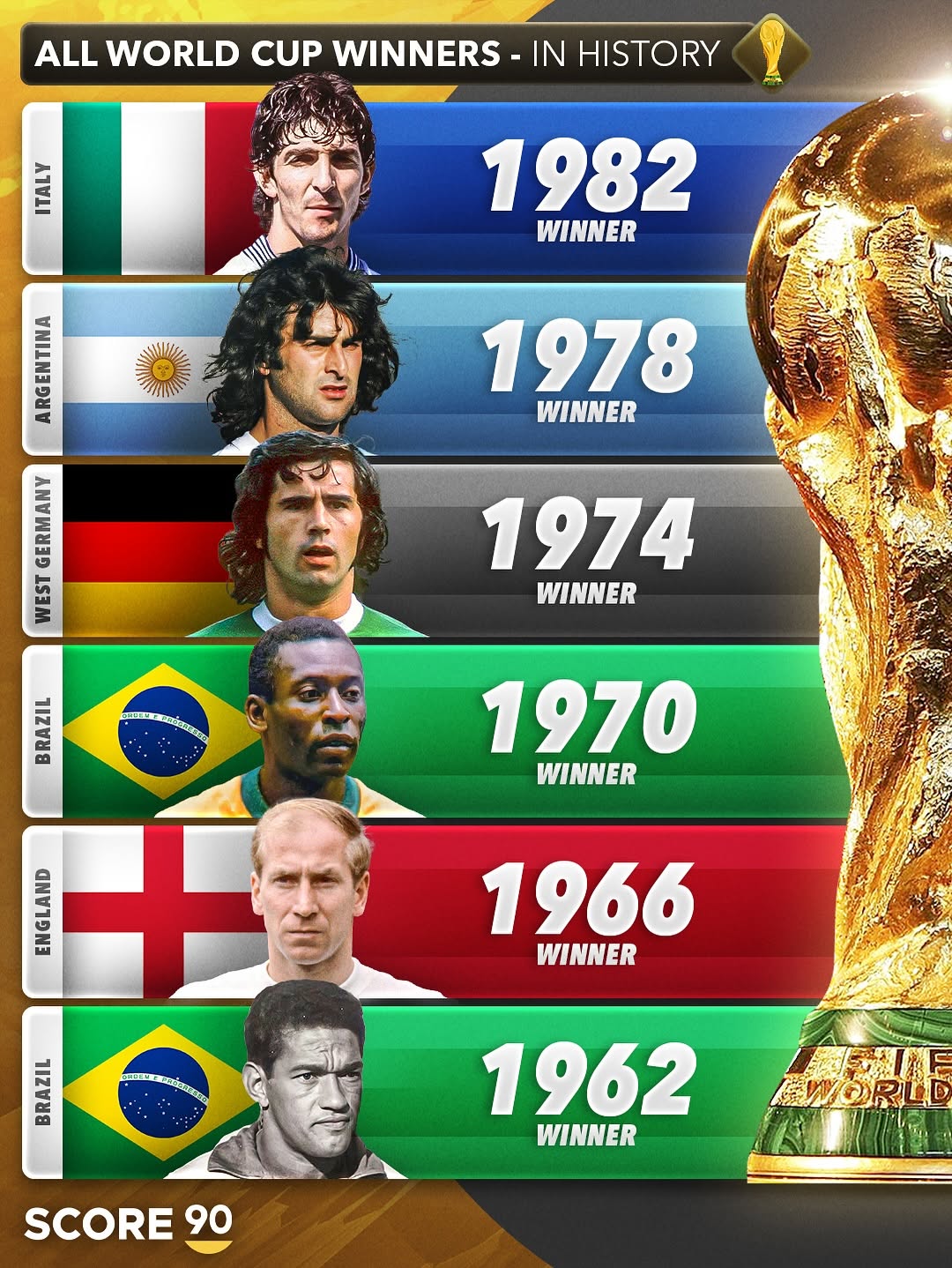 تصویر دوم، به دوران مدرنتر جام جهانی میپردازد؛ از سال ۲۰۰۶ تا ۲۰۲۲، عصری که تکنولوژی، تاکتیک و نسلهای طلایی فوتبال، چهرهی جدیدی به این تورنمنت بخشیدند. هر یک از تیمهای قهرمان این بازه، با سبک و فلسفهی متفاوتی توانستند نام خود را در تاریخ فوتبال جاودانه کنند.