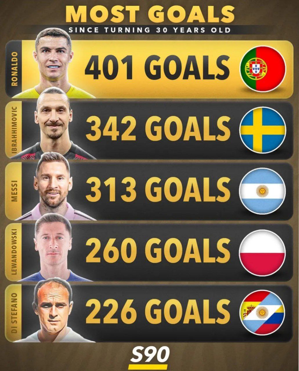 در جایگاه پنجم نیز نام آلفردو دی استفانو، اسطوره آرژانتینی-اسپانیایی باشگاه رئال مادرید به چشم میخورد که با ۲۲۶ گل پس از ۳۰ سالگی، میراثی بزرگ در تاریخ فوتبال از خود به جا گذاشته است. او از اولین بازیکنانی بود که نشان داد سن بالا مانع درخشش در فوتبال حرفهای نیست.