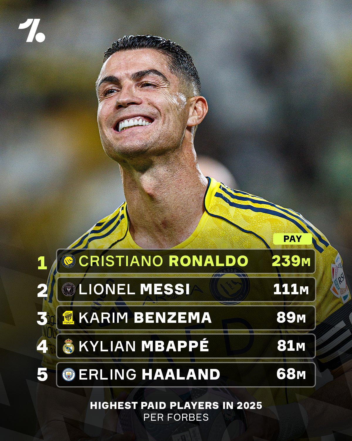 مجله فوربز لیست ۵ بازیکن برتر فوتبال از نظر درآمد میدانی (حقوق و جوایز مستقیم) در ۲۰۲۵ را منتشر کرد. رونالدو با ۲۳۹ میلیون یورو رکورددار است – بدون احتساب تبلیغات (مجموعش ۲۸۰ میلیون دلار!).