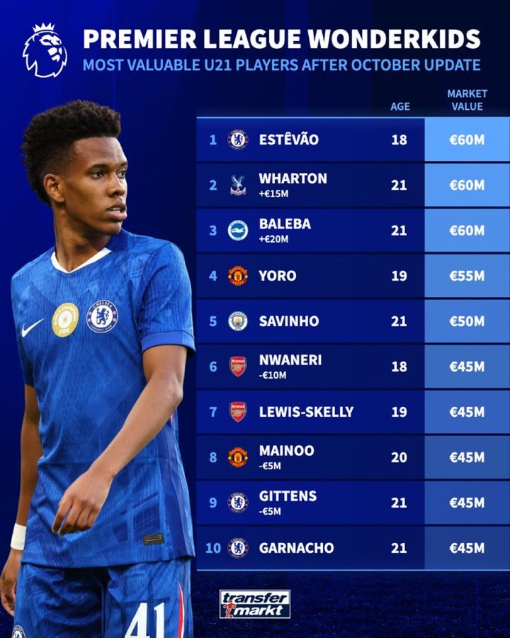 بر اساس بهروزرسانی اکتبر وبسایت معتبر Transfermarkt، استوائو پدیده ۱۸ ساله چلسی با ارزش ۶۰ میلیون یورو، عنوان گرانترین بازیکن زیر ۲۱ سال لیگ برتر انگلیس را به خود اختصاص داده است.