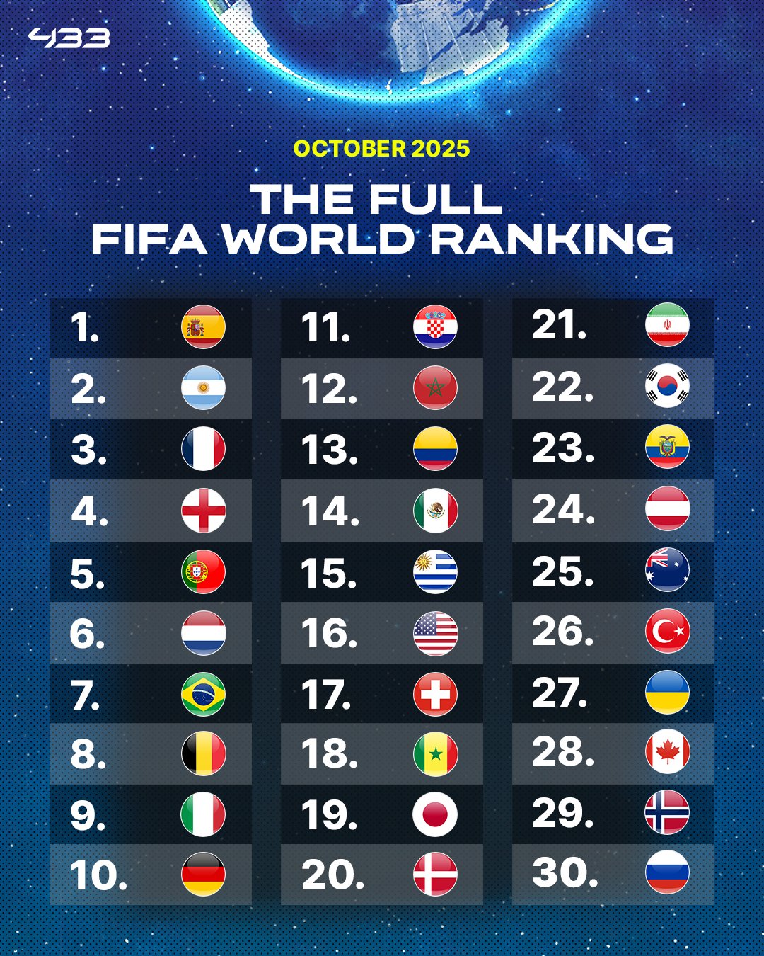 فدراسیون جهانی فوتبال (فیفا) ردهبندی تیمهای ملی را برای ماه اکتبر ۲۰۲۵ اعلام کرد. در این فهرست، اسپانیا با عملکردی درخشان در صدر جهان قرار گرفته است. پس از آن آرژانتین در رتبه دوم و فرانسه در جای سوم دیده میشوند.