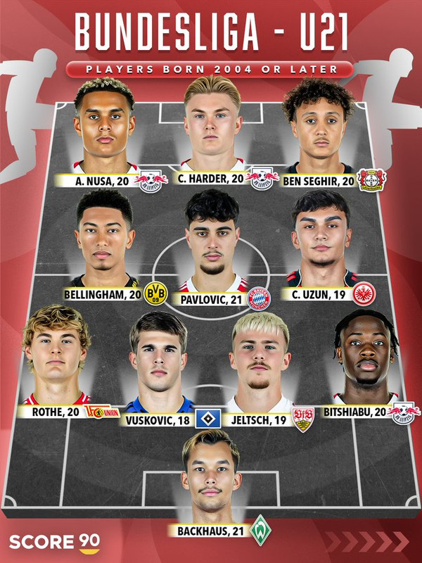 تیم منتخب زیر ۲۱ سال بوندسلیگا بر پایه استعدادهای نوظهور مانند آنتونیو نوسا (لایپزیگ)، الکساندر پاولوویچ (بایرن مونیخ) و کان اوزون (فرانکفورت) ساخته شده که در فصل ۲۰۲۵/۲۶ عملکرد درخشانی داشتهاند. این بازیکنان با تمرکز روی سرعت، خلاقیت و دفاع قوی، آینده لیگ آلمان را روشن میکنند و برخی مانند بیتشیابو و یلتش به عنوان مدافعان جوان برجسته شناخته میشوند.