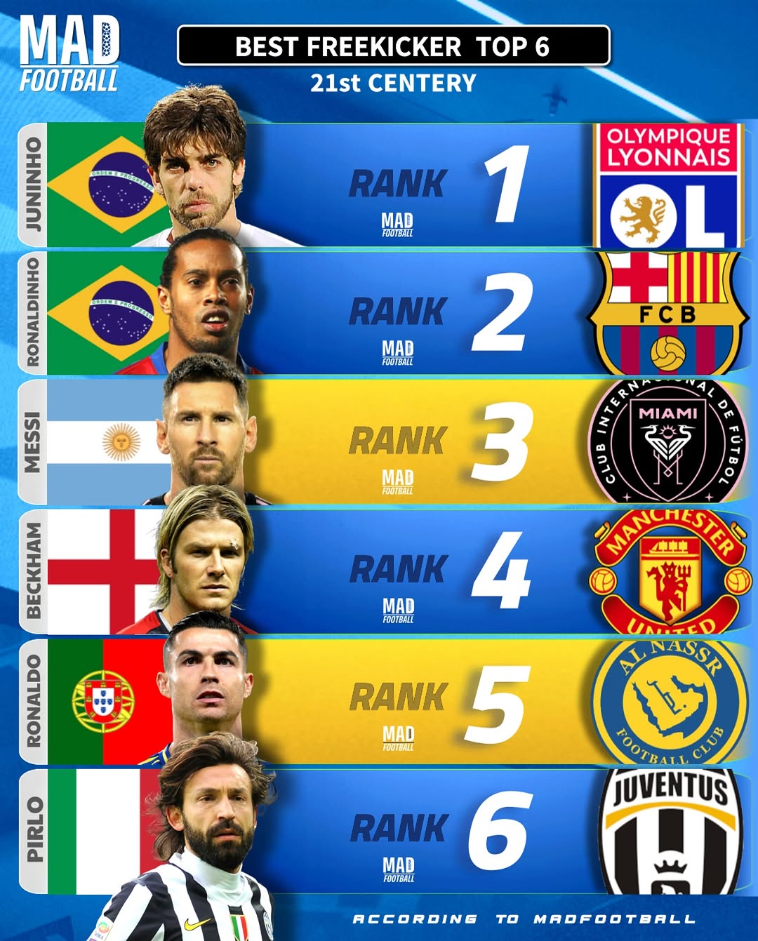 در این تصویر شاهد ردهبندی بهترین ضربهزنان ایستگاهی قرن ۲۱ میلادی هستیم، رتبهبندیای که توسط صفحه MAD FOOTBALL منتشر شده و بر اساس عملکرد بازیکنان در زدن ضربات کاشته شکل گرفته است. این لیست شامل شش بازیکن افسانهای از کشورهای مختلف است که هر کدام با سبک خاص خود در زدن ضربات آزاد، تاریخساز شدهاند.