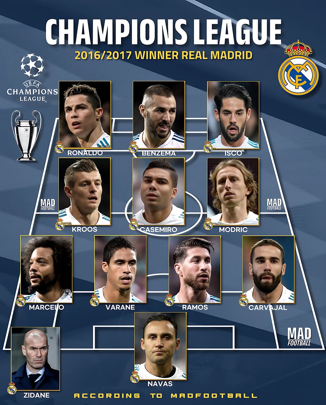 .در تصویر دوم، ترکیب افسانهای رئال مادرید قهرمان فصل ۲۰۱۶/۲۰۱۷ را میبینیم. تیمی که با هدایت زینالدین زیدان (Zinedine Zidane) به یکی از قدرتمندترین تیمهای تاریخ اروپا تبدیل شد و توانست برای دومین سال پیاپی قهرمان لیگ قهرمانان شود؛ کاری که پیش از آن هیچ تیمی در فرمت جدید این رقابتها انجام نداده بود. در ترکیب رئال، کیلور ناواس در دروازه عملکرد درخشانی داشت و در کنار راموس، واران، مارسلو و کارواخال دیواری نفوذناپذیر در خط دفاع تشکیل داد. در خط میانی، مثلث کروس، کاسمیرو و مودریچ با کنترل بازی، پاسهای دقیق و نظم تاکتیکی مثالزدنی، مغز متفکر تیم محسوب میشدند. در خط حمله نیز مثلث معروف BBC یعنی کریستیانو رونالدو، بنزما و ایسکو (در ترکیب فینال) قدرت هجومی بیرحمانهای به رئال داده بود. رونالدو با گلهای حساس خود، مخصوصاً در فینال برابر یوونتوس، نقش کلیدی در قهرمانی مادریدیها داشت.