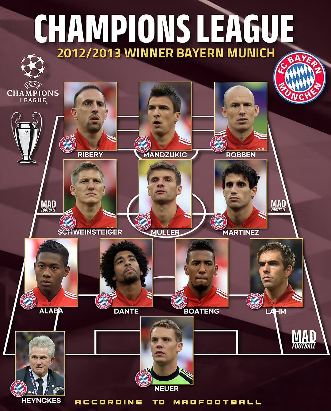 در تصویر نخست، ترکیب بایرن مونیخ قهرمان فصل ۲۰۱۲/۲۰۱۳ دیده میشود. تیمی که با هدایت یوپ هاینکس (Jupp Heynckes) توانست پس از سالها ناکامی، بر بام اروپا بایستد. در آن فصل، بایرن با پیروزی قاطع برابر بارسلونا در نیمهنهایی (با مجموع ۷-۰) و سپس غلبه بر دورتموند در فینال، قهرمانی را جشن گرفت. ستون اصلی این تیم را بازیکنانی چون مانوئل نویر در دروازه، فیلیپ لام بهعنوان کاپیتان در سمت راست، بواتنگ و دانته در قلب دفاع، و آلابا در سمت چپ تشکیل میدادند. در میانه میدان، ترکیب طلایی شواناشتایگر، مولر و مارتینز قدرت فیزیکی و تاکتیکی فوقالعادهای به بایرن میداد. در خط حمله نیز مثلث مرگبار ریبری، مانزوکیچ و روبن نقش اصلی را در خلق موقعیت و گلزنی داشتند. بازی ترکیبی و هماهنگ این تیم باعث شد بایرن مونیخ در فصل ۲۰۱۲/۱۳ سهگانه تاریخی (بوندسلیگا، جام حذفی و لیگ قهرمانان) را کسب کند