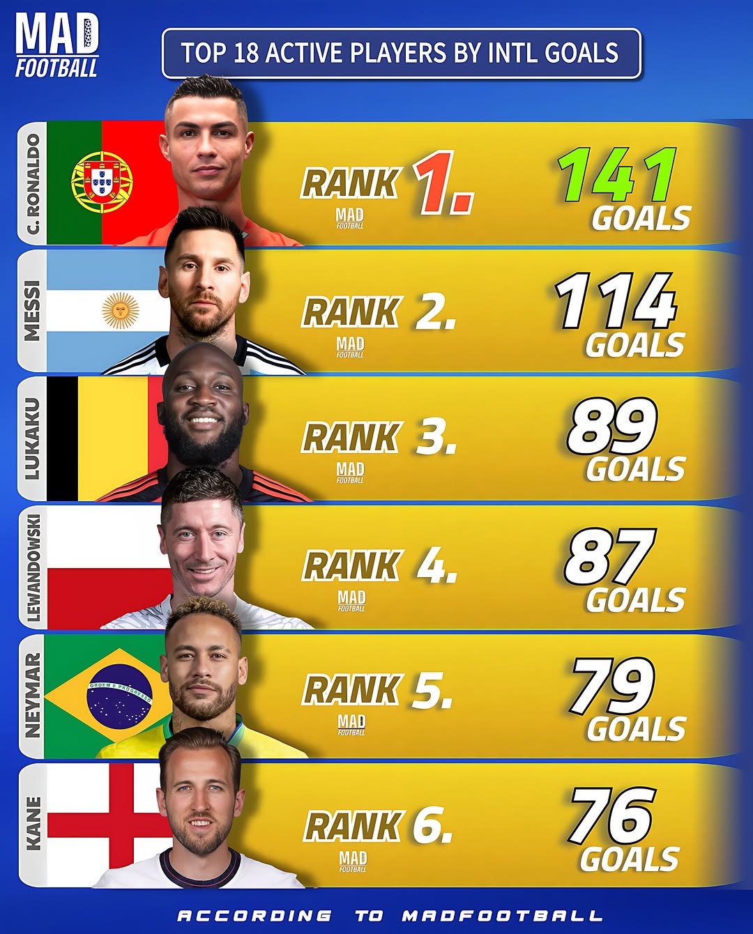 .این تصویر مربوط به جدول برترین گلزنان فعال فوتبال جهان در رده ملی است که توسط صفحهی MAD Football منتشر شده است. در این فهرست، نام شش فوقستاره بزرگ دنیای فوتبال دیده میشود که هر یک با عملکرد درخشان خود در بازیهای ملی، نقش مهمی در تاریخ فوتبال کشورشان ایفا کردهاند.