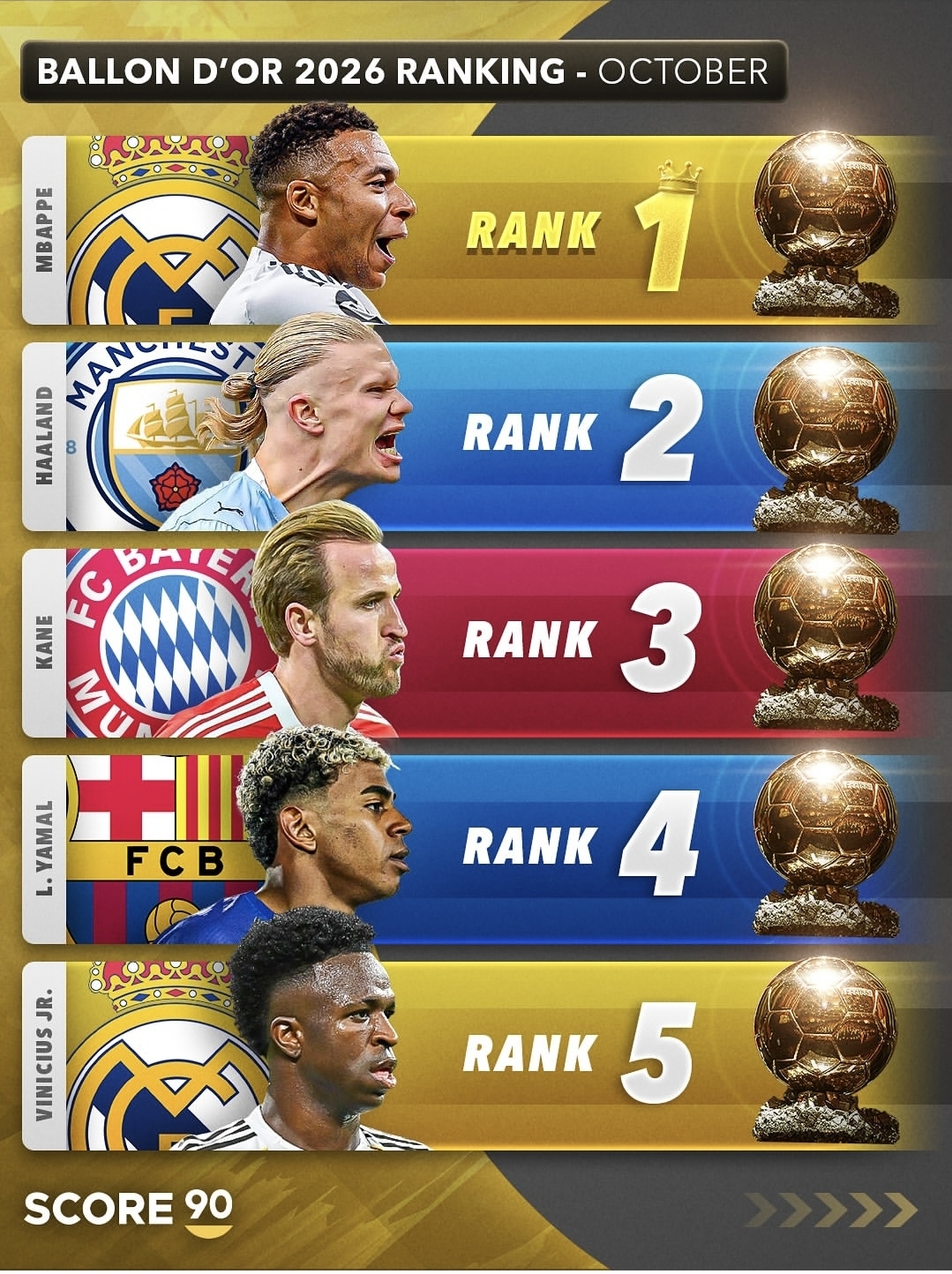 این دو تصویر، رتبهبندی احتمالی برندگان توپ طلا ۲۰۲۶ (Ballon d’Or 2026) را در ماه اکتبر نشان میدهند. این فهرست که توسط رسانهی معتبر Score 90 منتشر شده، شامل برترین بازیکنان فوتبال جهان در فصل جاری است که عملکرد درخشانی در باشگاهها و رقابتهای ملی داشتهاند. در این مقالهی سئوپسند، به بررسی دقیق این رتبهبندی و معرفی هر بازیکن میپردازیم.