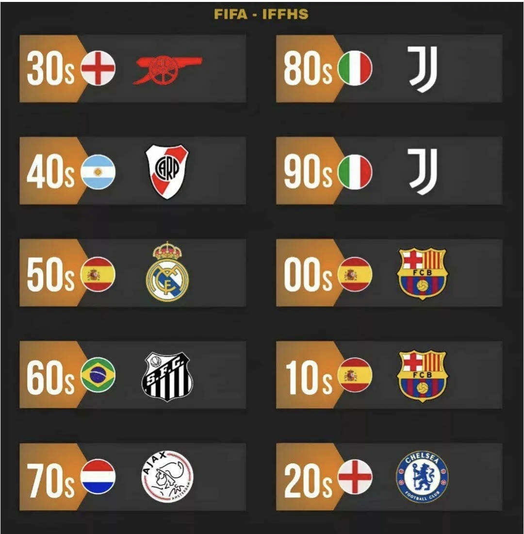 این لیست نشان میدهد فوتبال در هر دهه توسط تیمهای خاصی اداره و هدایت شده و این باشگاهها نه تنها موفقیت کسب کردهاند، بلکه شیوه و فرهنگ بازی فوتبال را تغییر دادهاند. از آرسنال دهه ۳۰ تا بارسلونای عصر مدرن و تیمهای تاریخی دیگر، همه آنها نقش مهمی در شکلگیری فوتبال امروز داشتهاند.