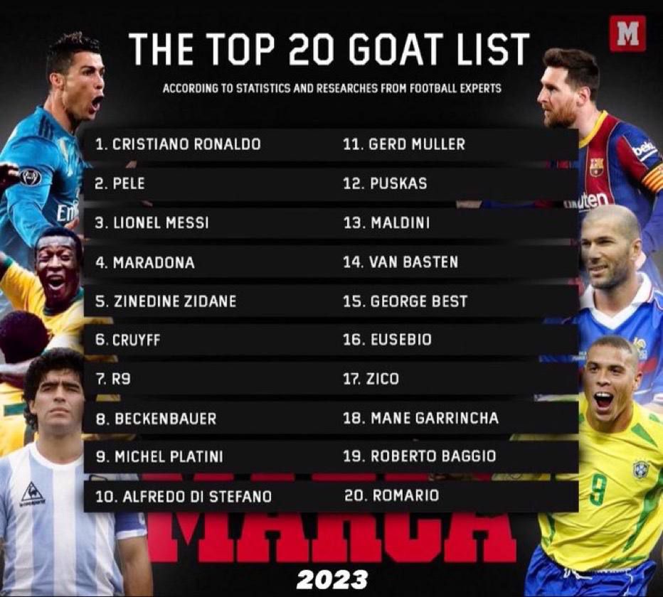 در این تصویر یک لیست ۲۰ نفره از بهترین بازیکنان تاریخ فوتبال (GOAT) نمایش داده شده است که بر اساس آمار و تحقیقات فوتبال انتخاب شدهاند. این جدول که به سال ۲۰۲۳ اشاره دارد، اسامی افسانههای بزرگ فوتبال جهان را در بر دارد؛ بازیکنانی که هر کدام با تکنیک، افتخارات و تأثیرگذاری بینظیر خود تاریخ این ورزش را تغییر دادهاند. در پسزمینه عکس چهره برخی بازیکنان مشهور فوتبال دیده میشود (بدون اشاره به هویت آنها)، و در میانه تصویر، ردهبندی اسامی بهصورت عددی درج شده است که نشاندهنده اهمیت و جایگاه هر یک در دنیای فوتبال است.