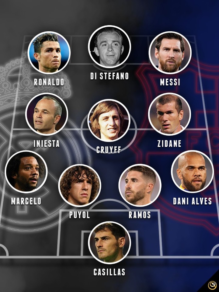 این تصویر ترکیب رویایی و منتخب تمام دوران فوتبال بین دو باشگاه بزرگ و پر افتخار اسپانیا، رئال مادرید و بارسلونا را به نمایش میگذارد. ترکیبی که شامل برترین ستارگان تاریخ این دو تیم است و بسیاری از کارشناسان فوتبال جهان آن را یکی از بهترین ترکیبهای ممکن در دنیای فوتبال میدانند. در این تصویر، بازیکنانی از هر دو تیم حضور دارند که هر کدام با درخشش خیرهکننده خود، فصلهای فراموشنشدنیای را در تاریخ فوتبال رقم زدهاند.