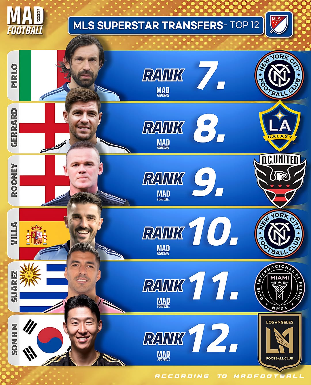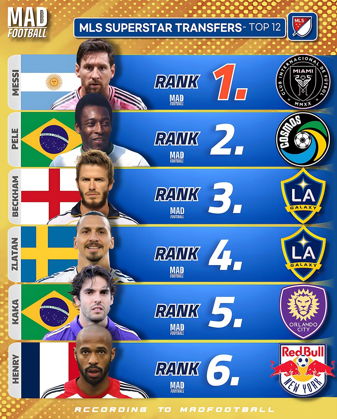 این دو تصویر مربوط به فهرستی از برترین انتقالهای ستارگان فوتبال به لیگ MLS آمریکا است که توسط صفحه MAD FOOTBALL منتشر شده است. این فهرست ۱۲ انتقال بزرگ و تأثیرگذار تاریخ لیگ آمریکا را معرفی میکند؛ بازیکنانی که هر یک با سابقه درخشان خود در فوتبال اروپا و جهان، نقش مهمی در رشد محبوبیت و اعتبار MLS داشتهاند. در ادامه، نگاهی تحلیلی و سئوپسند به این فهرست جذاب میاندازیم.