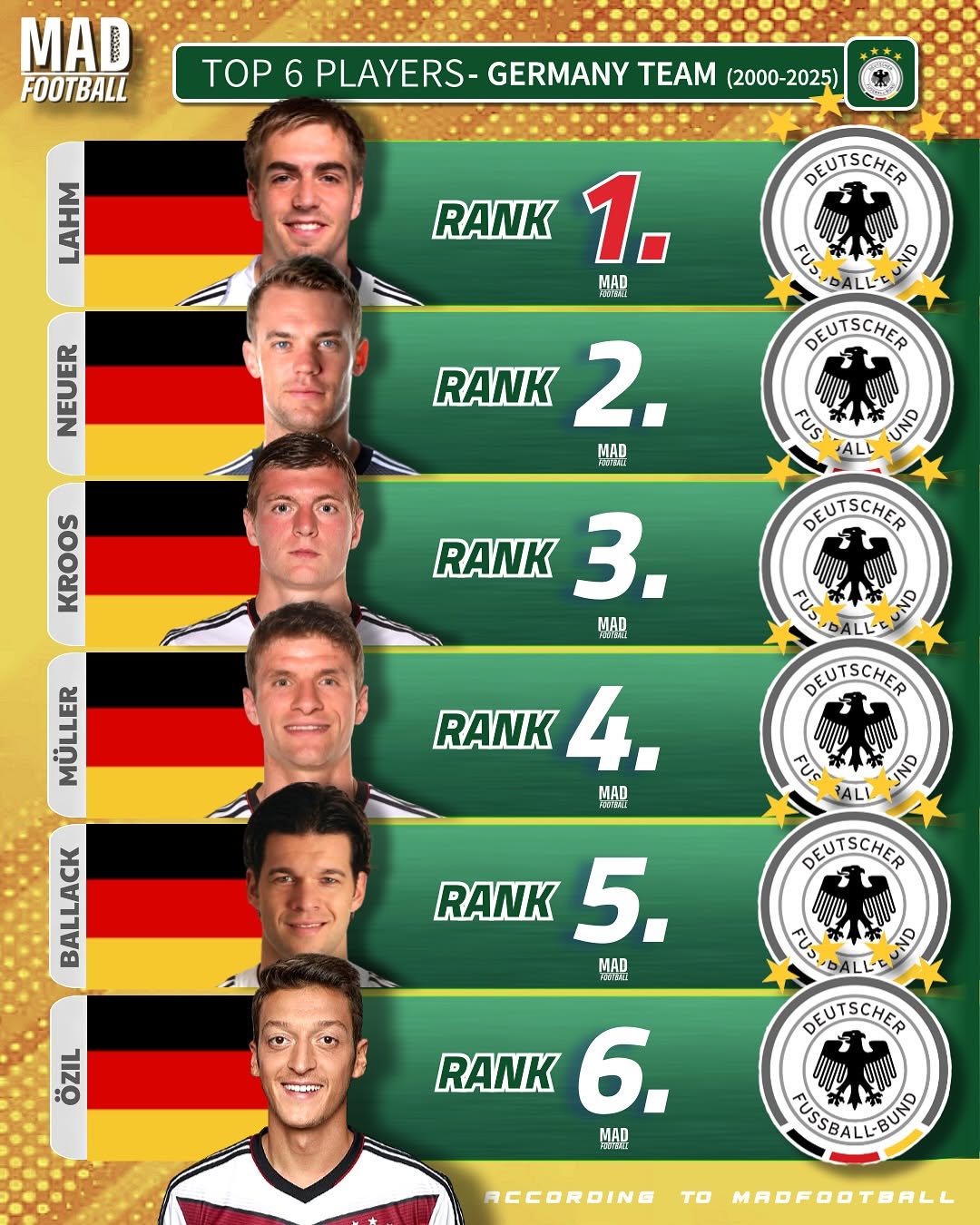 در مجموع، این تصویر نه تنها یک ردهبندی ساده از بازیکنان برتر آلمان است، بلکه نمادی از دوره طلایی فوتبال آلمان بین سالهای ۲۰۰۰ تا ۲۰۲۵ محسوب میشود. ترکیبی از هوش، نظم، تکنیک و قدرت تیمی در میان این شش ستاره باعث شده نام آنها برای همیشه در تاریخ فوتبال جهان ماندگار شود.