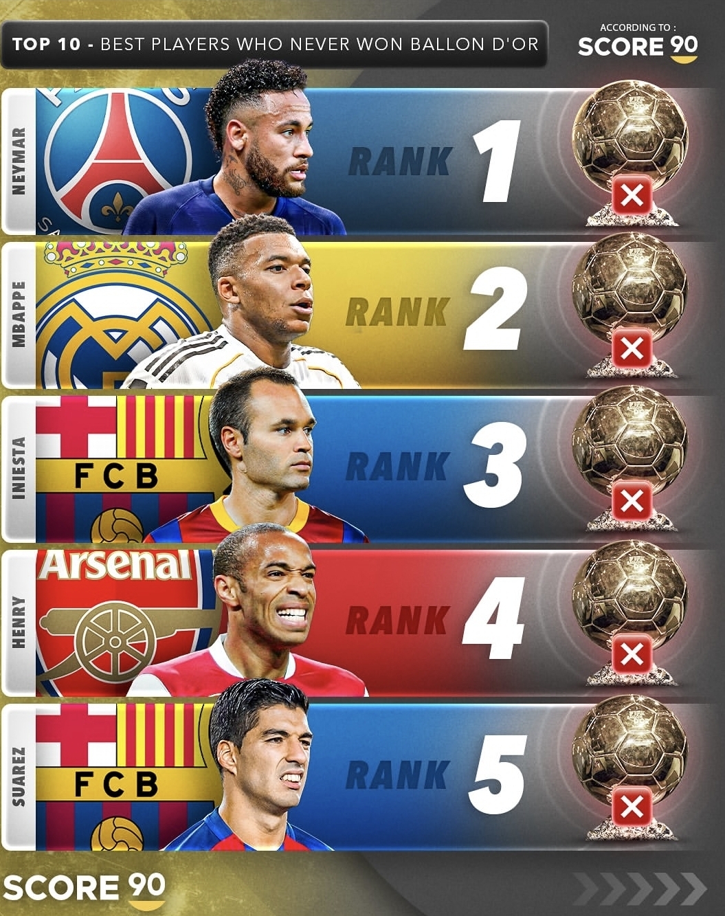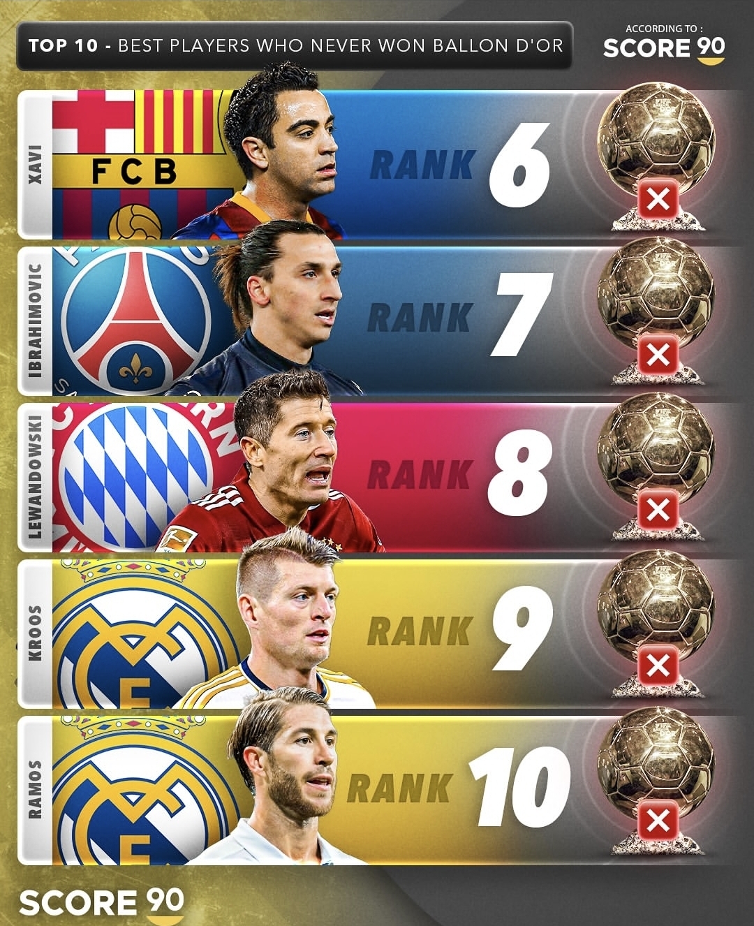 این لیست نشان میدهد که توپ طلا همیشه معیار قطعی برای سنجش بزرگی بازیکنان نیست. بسیاری از اسطورهها مانند نیمار، ژاوی، اینیستا یا راموس، هرچند این جایزه را کسب نکردند، اما در تاریخ فوتبال بهعنوان بازیکنانی ماندگار و افسانهای شناخته میشوند.