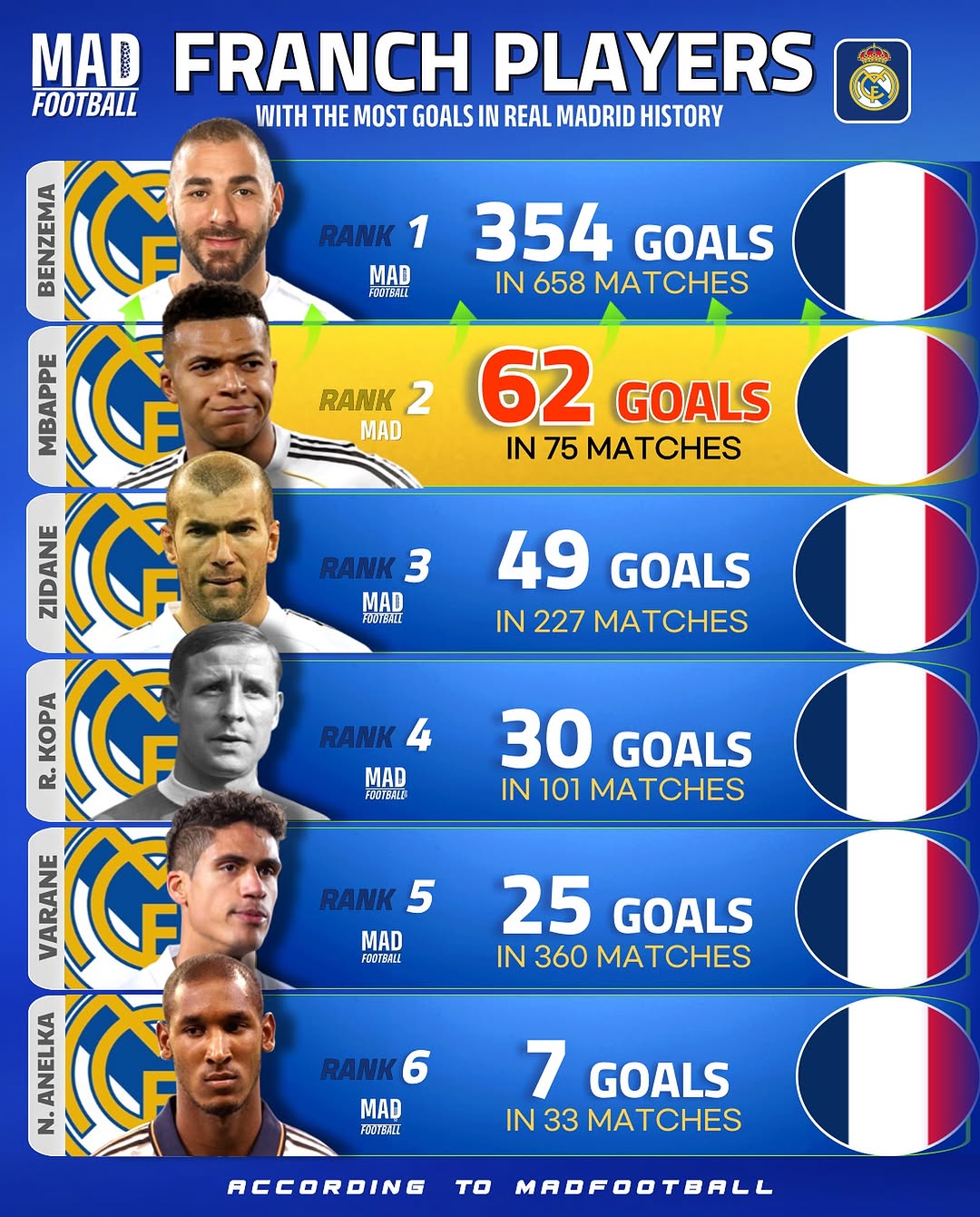 این تصویر مربوط به آمار بهترین بازیکنان فرانسوی در تاریخ باشگاه رئال مادرید از نظر تعداد گلهای زده است. طراحی این تصویر توسط صفحهی MAD Football انجام شده و به شکلی گرافیکی و جذاب، شش بازیکن مطرح فرانسوی را که با پیراهن باشگاه سلطنتی اسپانیا به میدان رفتهاند، مقایسه میکند. در این مقاله سئو پسند، به بررسی جزئیتر عملکرد هر یک از این ستارهها میپردازیم.