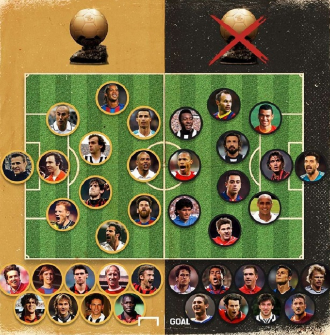 ترکیب منتخب برترین بازیکنانی که برنده توپ طلا شدند و برترین بازیکنانی که برنده توپ طلا نشدند:
