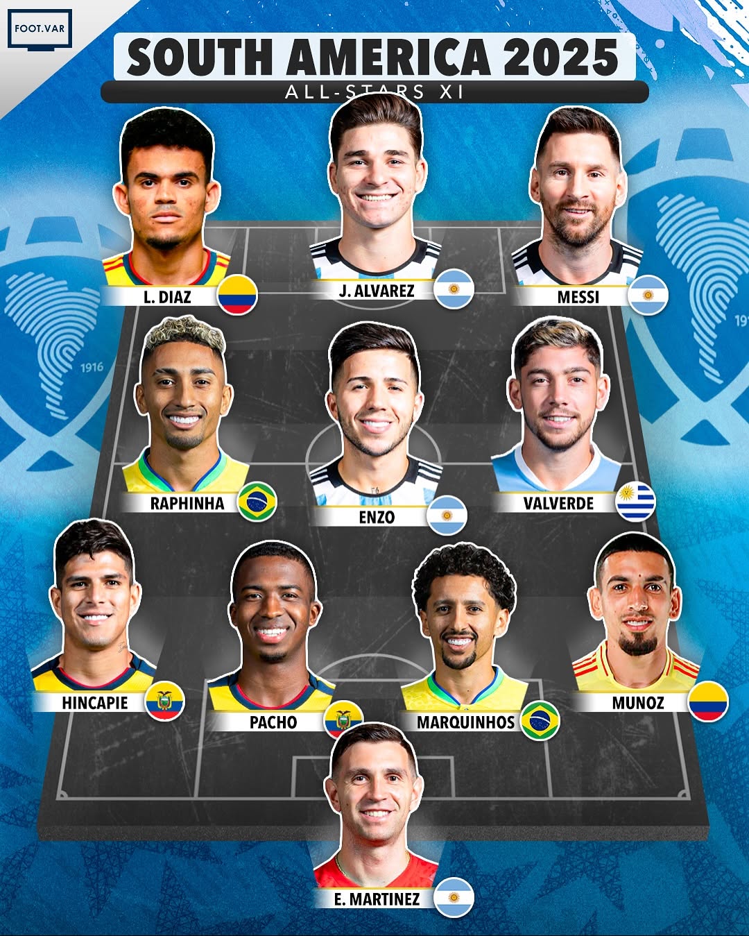ترکیب منتخب بهترین ستارگان فوتبال آمریکای جنوبی در سال 2025 با حضور لیونل مسی _ رافینیا _ لوئیس دیاز _ فدریکو والورده / مسی 38 ساله همچنان جزو بهترین های دنیا