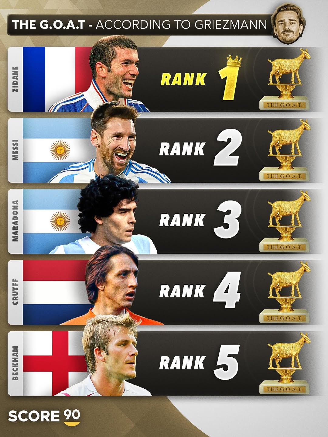 در این لیست، زینالدین زیدان به عنوان رتبه اول معرفی شده است. زیدان که اسطوره فوتبال فرانسه و یکی از تکنیکیترین هافبکهای تاریخ محسوب میشود، با قهرمانی در جام جهانی ۱۹۹۸، یورو ۲۰۰۰ و درخشش در رئال مادرید، جایگاه ویژهای در قلب فوتبالیستها دارد. قدرت رهبری، کنترل توپ بینقص و تأثیرگذاری او در لحظات حساس باعث شده گریزمان او را شایسته عنوان بهترین بازیکن تاریخ بداند.