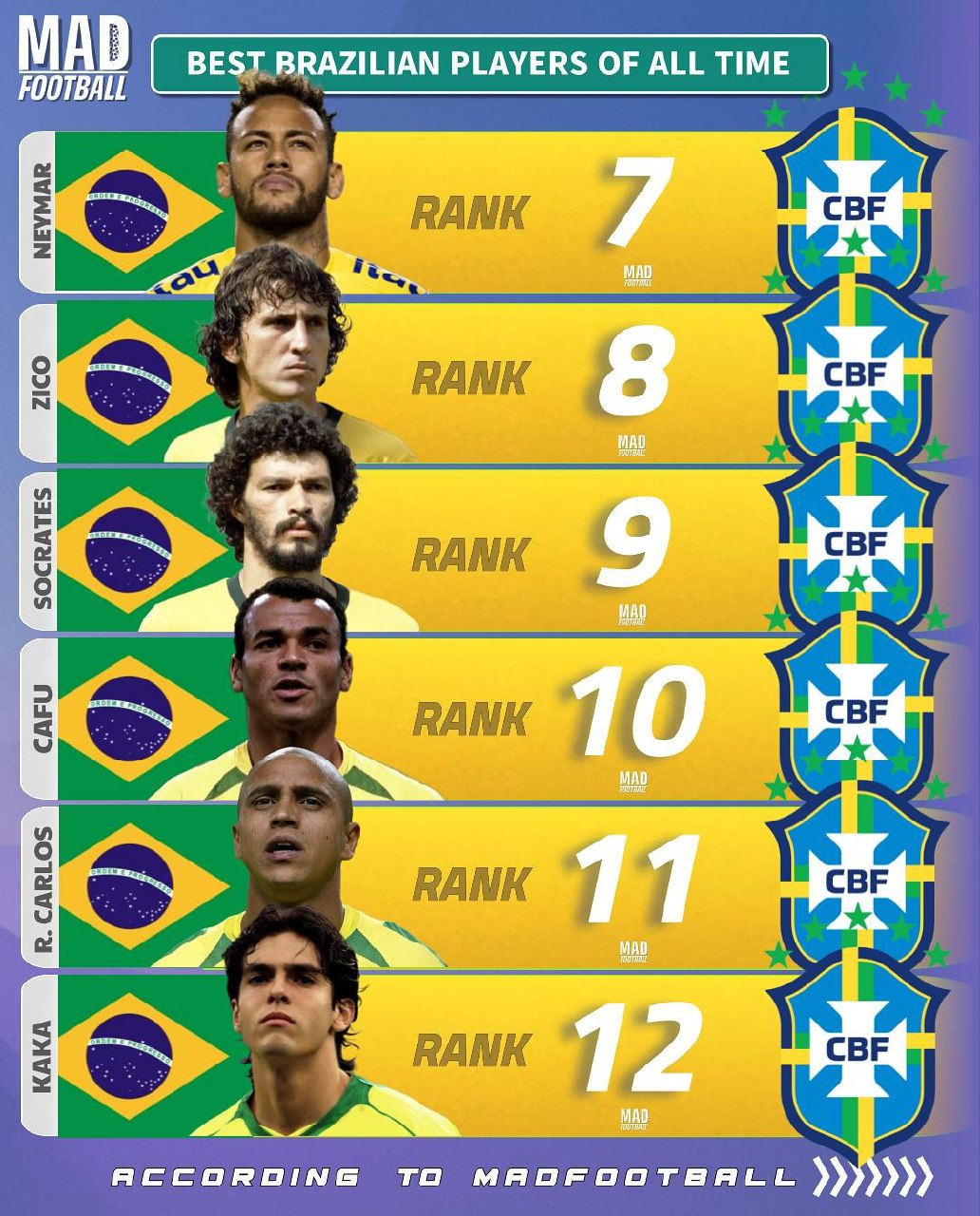 در بخش دوم این لیست، نیمار در رتبه هفتم قرار دارد؛ ستاره نسل جدید فوتبال برزیل که با تکنیک فوقالعاده و آمار گلزنی بالا، جایگاه ویژهای در فوتبال این کشور دارد. رتبه هشتم متعلق به زیکو است؛ بازیکنی که بسیاری او را کاملترین هافبک تاریخ برزیل میدانند. بعد از او سقراط در رتبه نهم دیده میشود؛ کاپیتان تیم افسانهای ۱۹۸۲ که بهخاطر هوش درون و بیرون زمین مشهور بود.