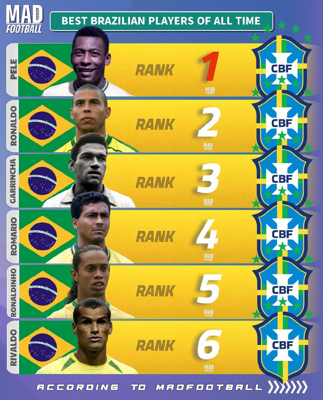 فوتبال برزیل همواره بهعنوان نماد تکنیک، خلاقیت و نبوغ در جهان شناخته میشود و ستارههای بزرگی از این کشور در تاریخ این ورزش ماندگار شدهاند. در این تصویر جذاب، لیستی از ۱۲ بازیکن برتر تاریخ فوتبال برزیل ارائه شده که هرکدام نقشی مهم در موفقیتهای تیم ملی برزیل داشتهاند. این ردهبندی که توسط MADFOOTBALL تهیه شده، شامل اسامی افسانهای از جمله پله، رونالدو، گارینشا، رونالدینیو، روماریو، زیکو، کاکا، روبرتو کارلوس و دیگر اسطورههای فراموشنشدنی است.
