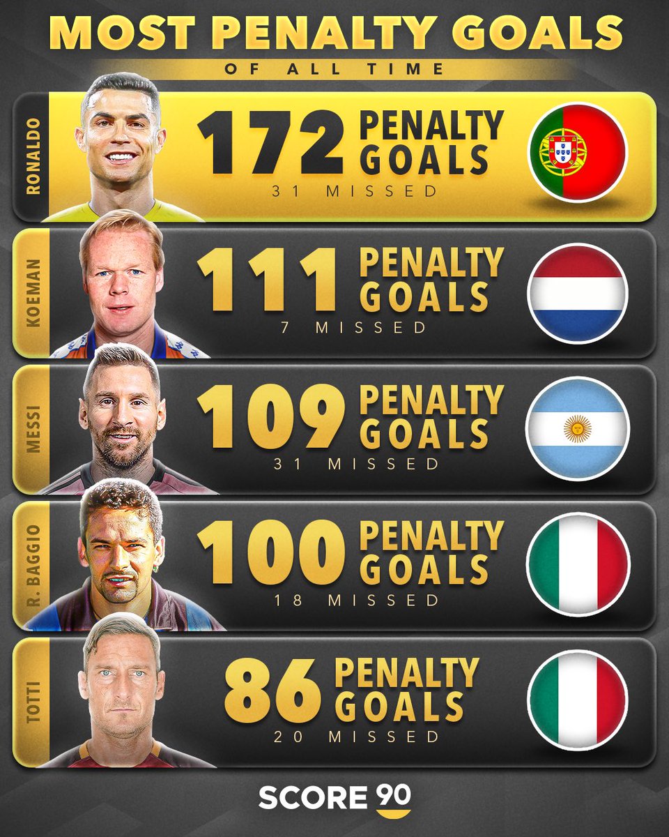 ۱. کریستیانو رونالدو (پرتغال) – ۱۷۲ گل پنالتی، ۳۱ از دست رفته