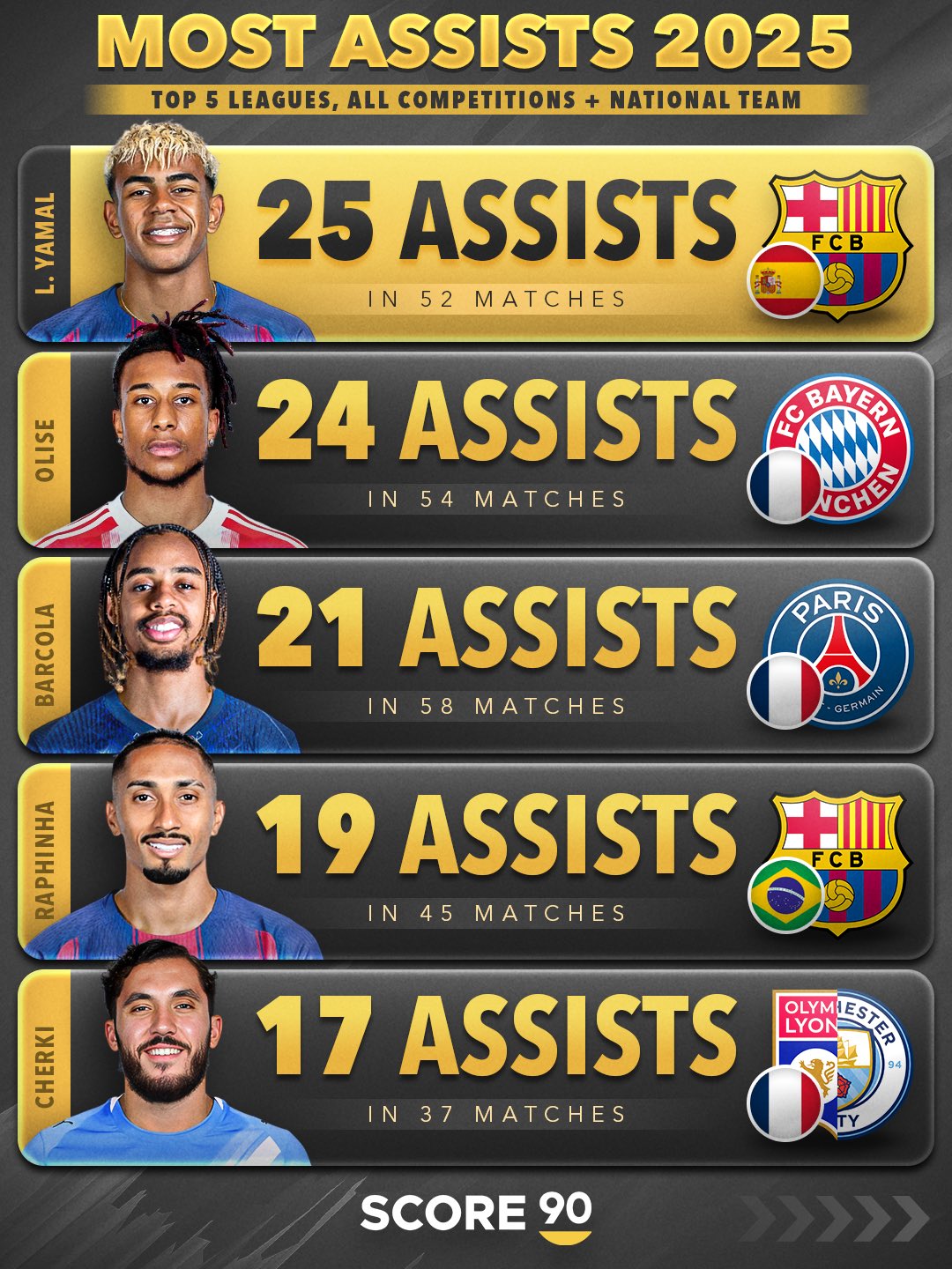 در رتبه دوم، مایکل اولیسه از بایرن مونیخ با ۲۴ پاسگل در ۵۴ مسابقه حضور دارد؛ رقابتی نزدیک با یامال. اولیسه پس از انتقال به بایرن، خیلی زود خود را بهعنوان یکی از بهترین پاسدهندگان بوندسلیگا ثابت کرده و با سرعت و دقت پاسهایش، خط حمله این تیم را قدرتمندتر کرده است. عملکرد او در فصل جاری یادآور روزهای اوجش در کریستال پالاس است.