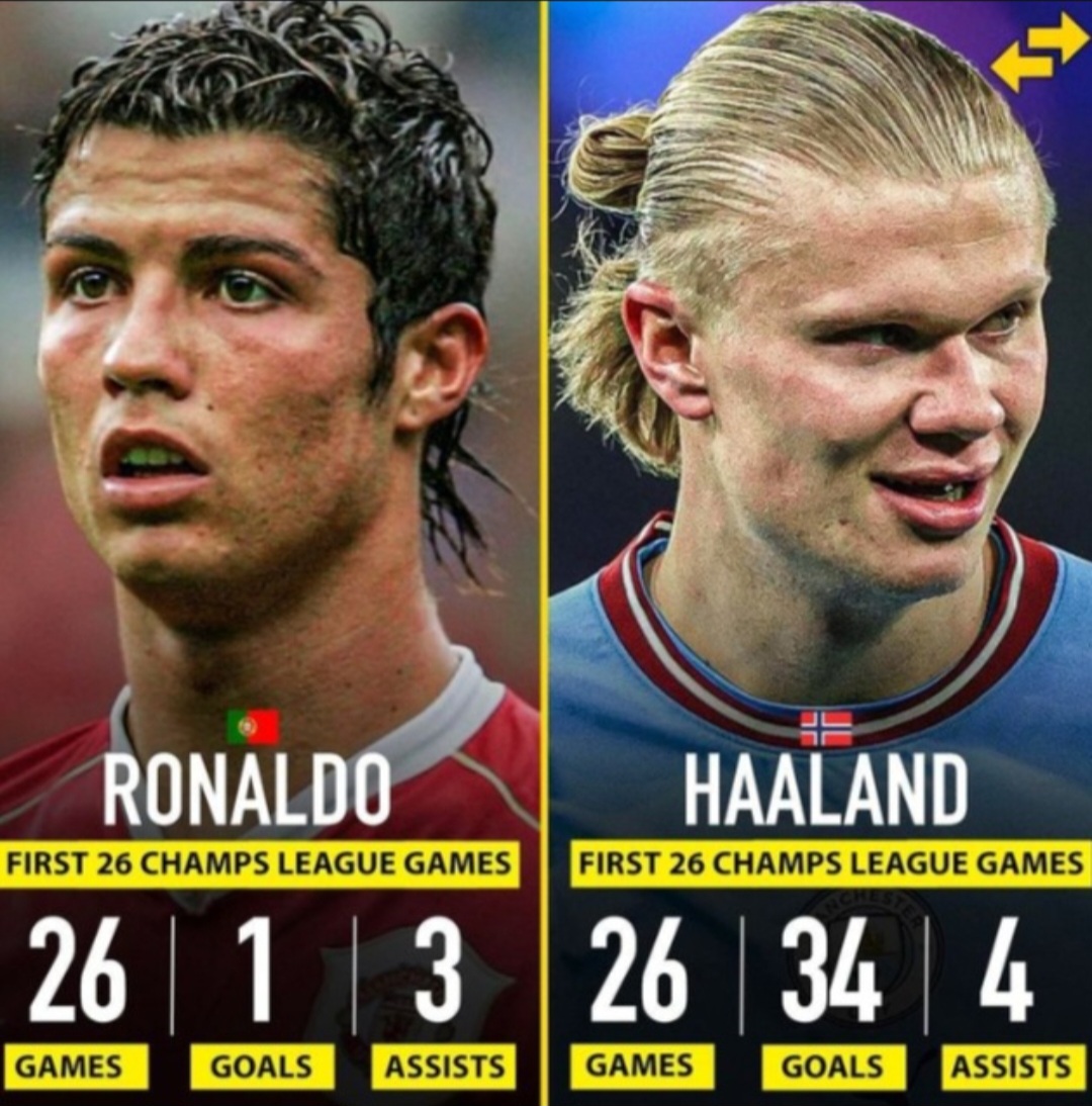 مقایسه عملکرد کریستیانو رونالدو و ارلینگ هالند در ۲۶ بازی اول خود در لیگ قهرمانان اروپا ؛ برتری شگفت انگیز غول نروژی نسبت به CR7!