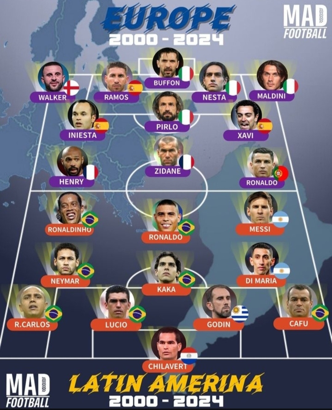 ترکیب منتخب اروپا و آمریکای جنوبی در قرن ۲۱ ؛ با حضور لیونل مسی، رونالدینیو و زین الدین زیدان