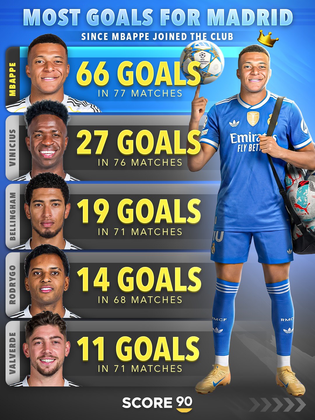 طبق آماری که اخیراً توسط Score 90 منتشر شده، امباپه با زدن ۶۶ گل در ۷۷ بازی، فاصله زیادی با همتیمیهای خود ایجاد کرده و تاج پادشاهی گلزنی را بر سر گذاشته است.