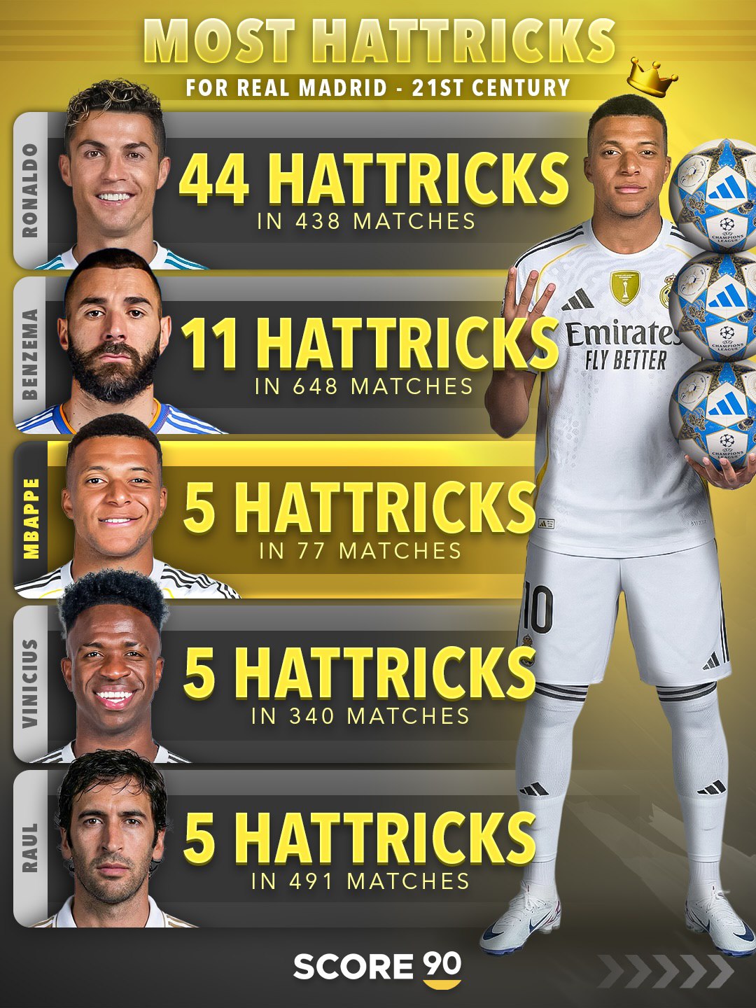 رائول گونزالس، کاپیتان سابق رئال، با ۵ هتتریک در ۴۹۱ بازی، لیست را کامل میکند. رائول که از اوایل قرن ۲۱ در رئال بازی میکرد، نماد وفاداری و رهبری است. هتتریکهای او در دوران طلایی رئال در لالیگا و لیگ قهرمانان، خاطرات زیادی برای هواداران ساخته. میانگین یک هتتریک در هر ۹۸ بازی، با توجه به تعداد بالای مسابقات، همچنان قابل احترام است.