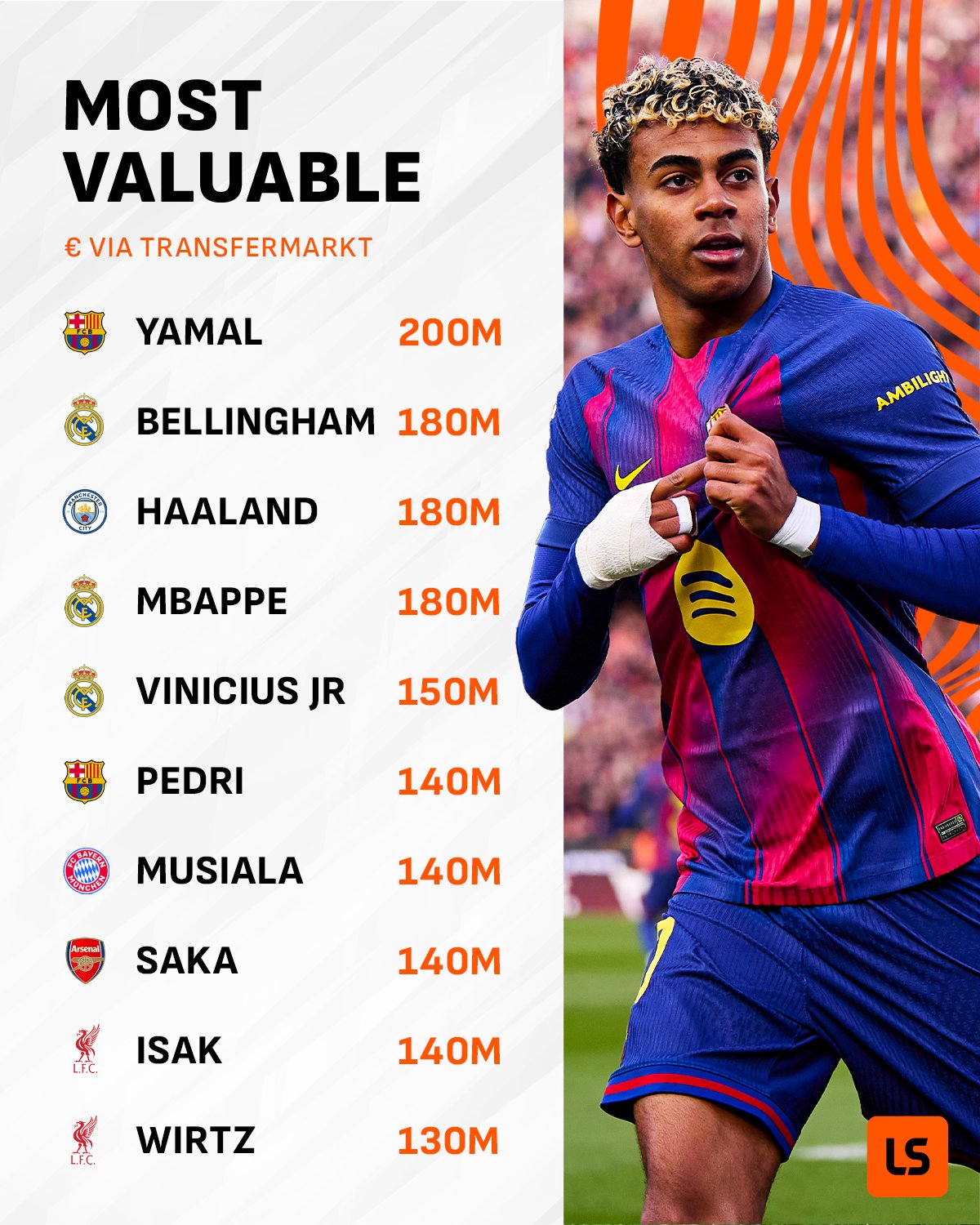 در آخرین بروزرسانی ترانسفرمارکت، لامین یامالِ ۱۸ ساله با رسیدن به ارزش ۲۰۰ میلیون یورو عنوان گرانترین بازیکن فوتبال جهان را از آن خود کرد. رشد خیرهکننده او در بارسلونا باعث شده در صدر نسل جدید ستارهها قرار بگیرد.