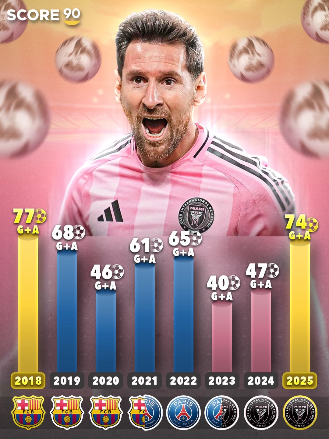 و حالا در اینتر میامی، مسی با آمار ۴۰ در ۲۰۲۳ و ۴۷ در ۲۰۲۴ دوباره خود را با لیگ جدید تطبیق داد—و در ۲۰۲۵ به یک انفجار دوباره رسید: ۷۴ گل + پاس گل!