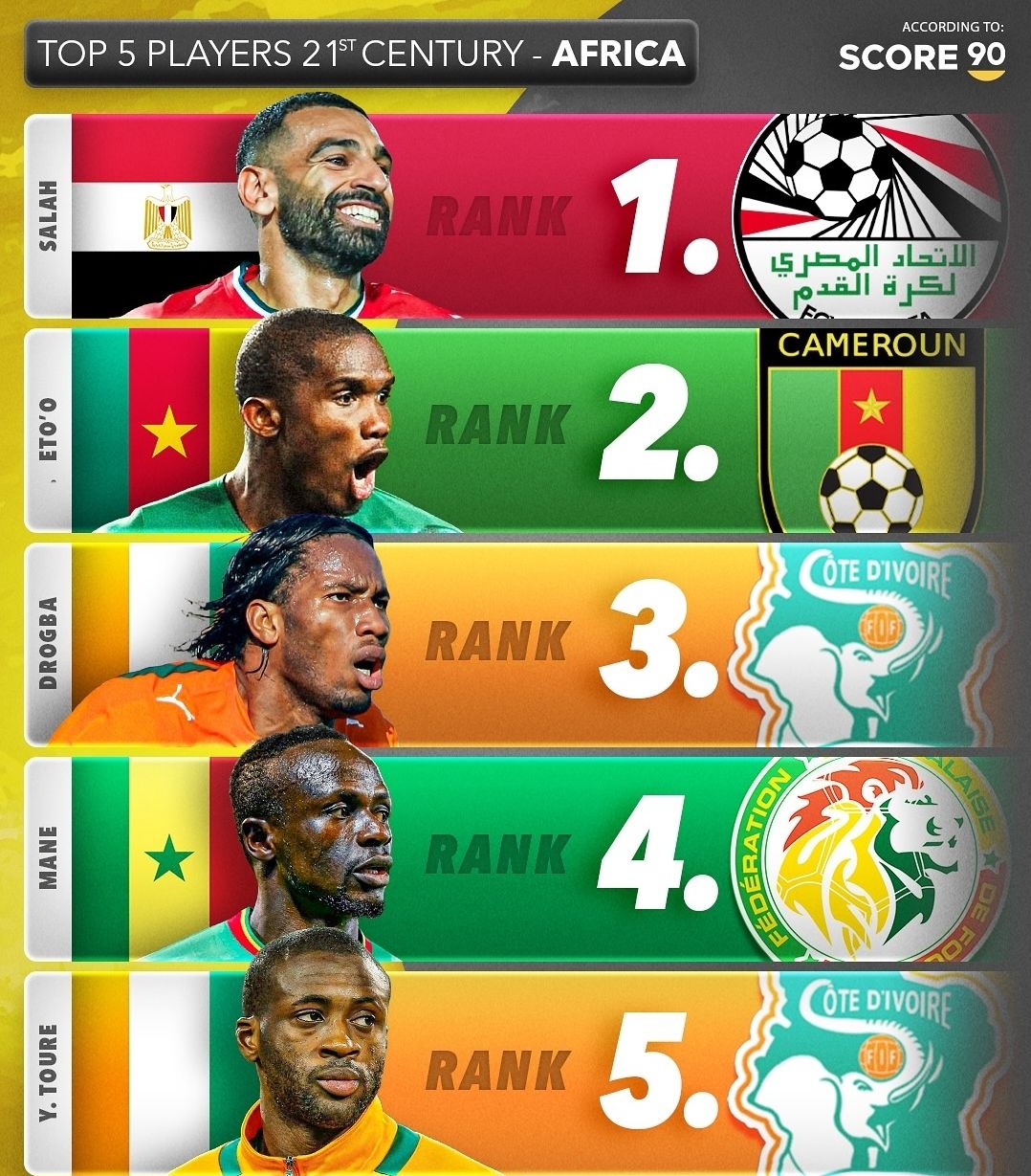 5_ یحیی توره ، توره بازیکن فوتبال ساحل عاج، عملکرد خوبی در تیم ملی این کشور داشته است. او ۱۰۰ بازی ملی انجام داده و ۱۹ گل به ثمر رسانده است. او همچنین پنج بار عنوان مرد سال فوتبال آفریقا را کسب کرده است. یحیی توره به عنوان یک هافبک کامل و همه کاره شناخته میشد و قادر به بازی در پستهای مختلف از جمله هافبک دفاعی، هافبک باکس به باکس و حتی مدافع میانی بود.
