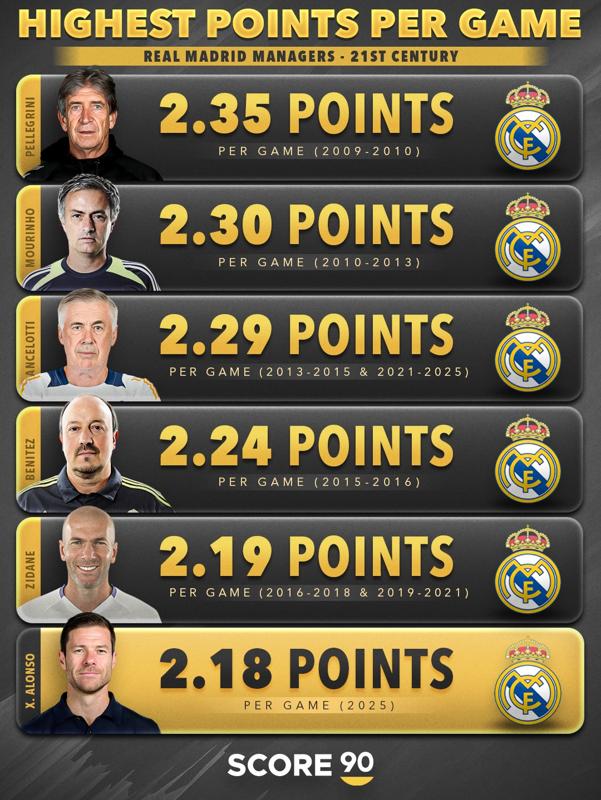 مانوئل پلگرینی با میانگین ۲٫۳۵ امتیاز در هر بازی بهترین عملکرد را ثبت کرده و پس از او ژوزه مورینیو و کارلو آنچلوتی قرار دارند؛ مربیانی که هم نتیجه گرفتند و هم اثر ماندگار گذاشتند.