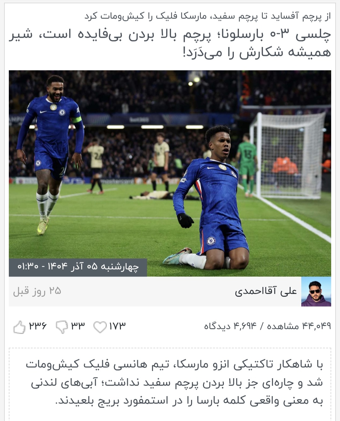 بارسای پرادعا با خط دفاعی بالا اومد، اما مارسکا با کانترهای سریع و پرسینگ هماهنگ، اونا رو نابود کرد. پالمر و مدوئکه با سرعتشون خط دفاع رو پاره کردن، و دفاع چلسی (با رهبری کولوویل) حتی یه گل نخورد. این برد نشون داد سبک پوزیشنی مارسکا چقدر کشندهست وقتی تیم جوونش هماهنگ بشه. این هنر مارسکاست که بارسلونای هجومی و جذاب فلیک را با این نتیجه شکست دهد.. کاری که فکر میکردند نشدنی است اما مثل با پاریس همه دیدند مارسکا در روزهای خوب خود چقدر میتواند کشنده باشد.. اگر مدیریت و بازیکنان با او راه بیایند و هواداران عاشقانه از او حمایت کنند!