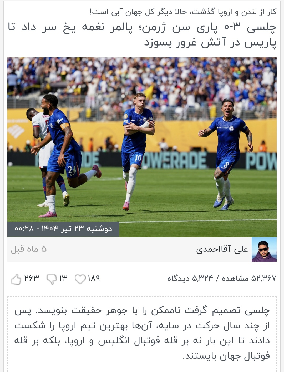 این برد خالص تاکتیکی بود! مارسکا با پرسینگ بالا و شدید از نیمه اول، خط دفاع PSG رو کامل فلج کرد. کول پالمر دو گل زد (یکی با دریبل هوشمندانه و یکی با شوت دقیق از فاصله)، و ژوائو پدرو با یه ضربه سر از روی سانتر دقیق گوستو، کار رو تموم کرد. PSG که قهرمان چمپیونز لیگ بود و همه فکر میکردن "غیرقابل شکست" هست، اما حتی یه شوت درست حسابی نزد! مارسکا تاکتیکشون رو مثل کتاب باز خوند و با کنترل میانه میدان (کایسدو و فرناندز حاکم مطلق بودن)، قهرمان جهان شد. ژابی هم به تیم نایب قهرمان در نیمه نهایی با نتیجه وقیحانه ۴ بر صفر باخت که این را پای کمبود فرصت برای آشنایی و تمرین با بازیکنان گذاشتند. اما ۴تا خوردن و نزدن هیچ گلی بسیار تعجب برانگیز است!