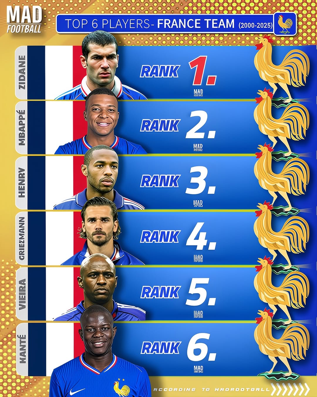 این تصویر جذاب و گرافیکی با عنوان «TOP 6 PLAYERS – FRANCE TEAM (2000–2025)» شش ستاره برتر تیم ملی فرانسه در دوران مدرن فوتبال را معرفی میکند. طراحی حرفهای و رنگآمیزی آبی و طلایی، حس افتخار و عظمت تیم ملی فرانسه را بهخوبی القا میکند. در این رتبهبندی، از سال ۲۰۰۰ تا ۲۰۲۵، شش بازیکن بزرگ که هر یک نقش مهمی در افتخارات «خروسهای آبی» داشتهاند، معرفی شدهاند.