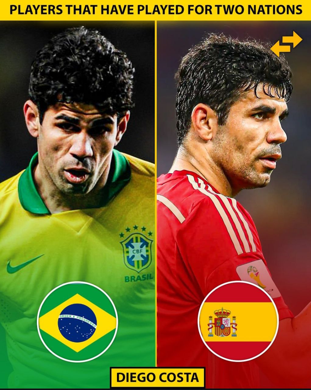دیگو کوستا در تیم ملی برزیل ۲ بازی ملی انجام داد ولی گلزنی نکرد. این بازیها در سال ۲۰۱۳ بود و او پس از آن به تیم ملی اسپانیا پیوست.