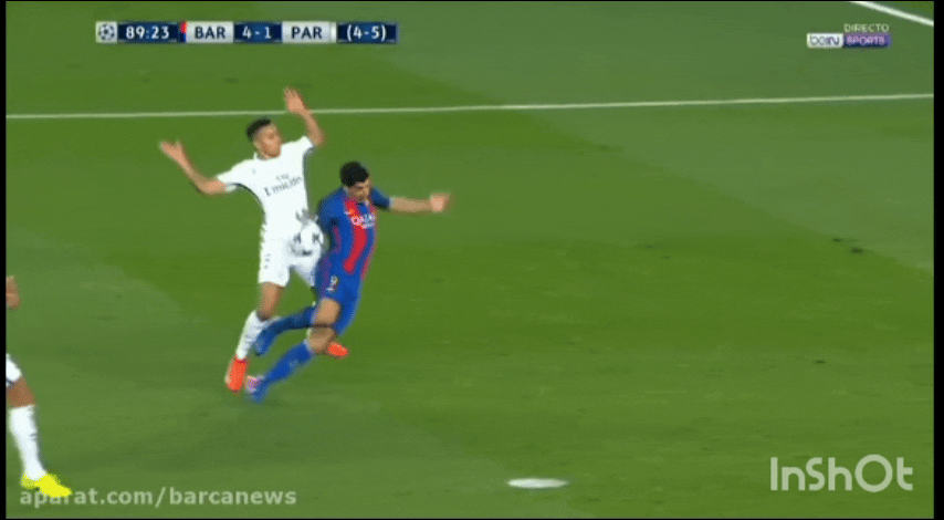 عدم دادن کارت زرد دوم به پیکه به دلیل جلوگیری از ضد حمله پاریس با خطا دقیقه 42(هم پارو زد هم هل داد)