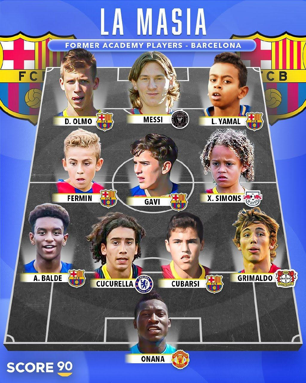 در خط حمله، دنی اولمو، لیونل مسی و لامین یامال حضور دارند. مسی بهعنوان بزرگترین خروجی تاریخ لاماسیا، نماد موفقیت این آکادمی است. او با کسب توپهای طلا، قهرمانیهای متعدد لالیگا و لیگ قهرمانان اروپا، ثابت کرد که مدل توسعه بازیکن در بارسلونا میتواند اسطوره بسازد. در کنار او، دنی اولمو که مدتی خارج از بارسلونا رشد کرد، و لامین یامال، پدیده نسل جدید، نماینده دو دوره متفاوت از تولید استعداد در لاماسیا هستند. یامال با سن کم خود نشان داده که آینده خط حمله بارسا میتواند همچنان بر پایه بازیکنان آکادمی شکل بگیرد.